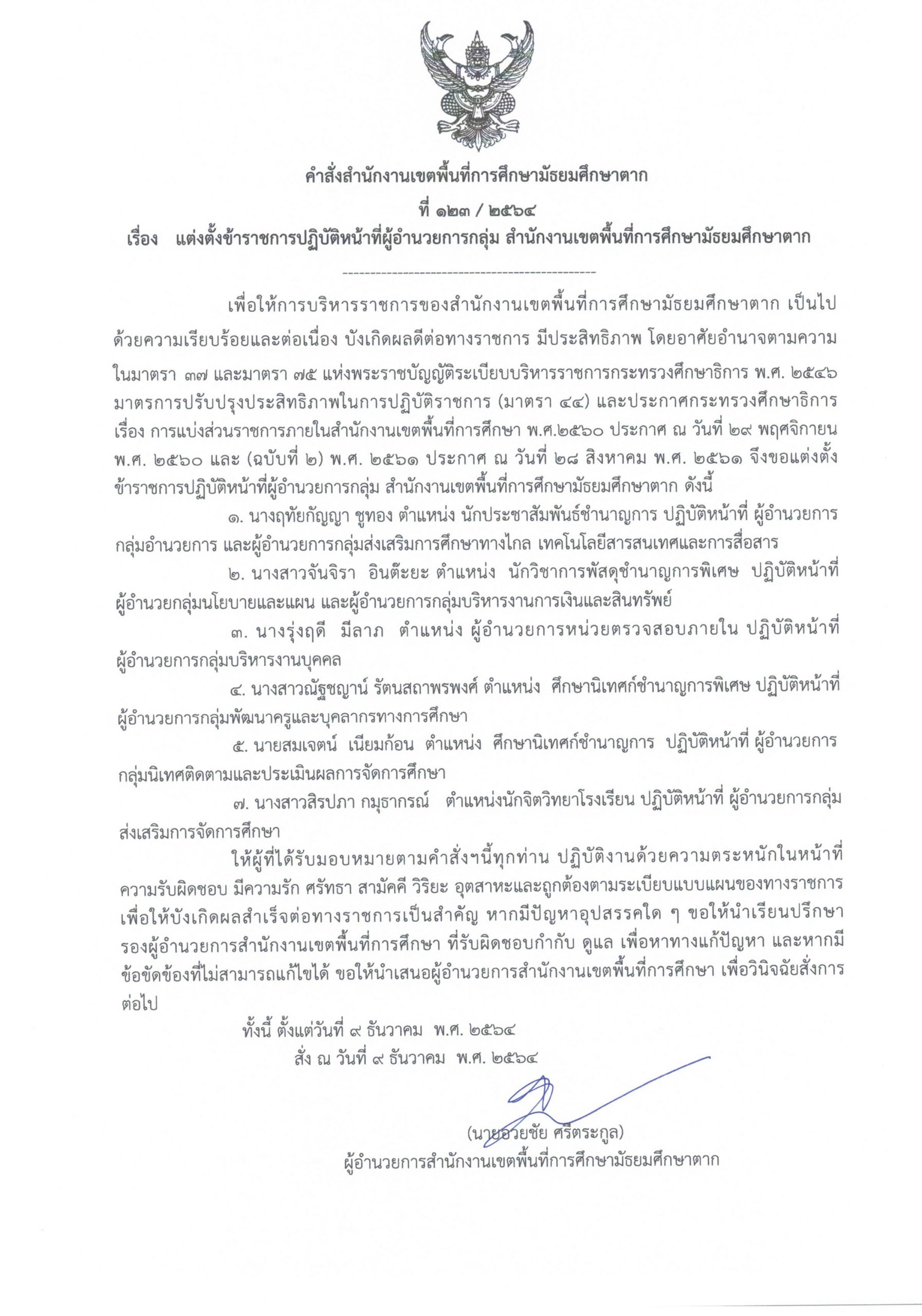 แต่งตั้งข้าราชการปฏิบัติหน้าที่ผู้อำนวยการกลุ่ม สำนักงานเขตพื้นที่การศึกษามัธยมศึกษาตาก วรวุฒิ เนื้อนิ่ม 22 ธันวาคม 2564 จำนวนคนดู 394