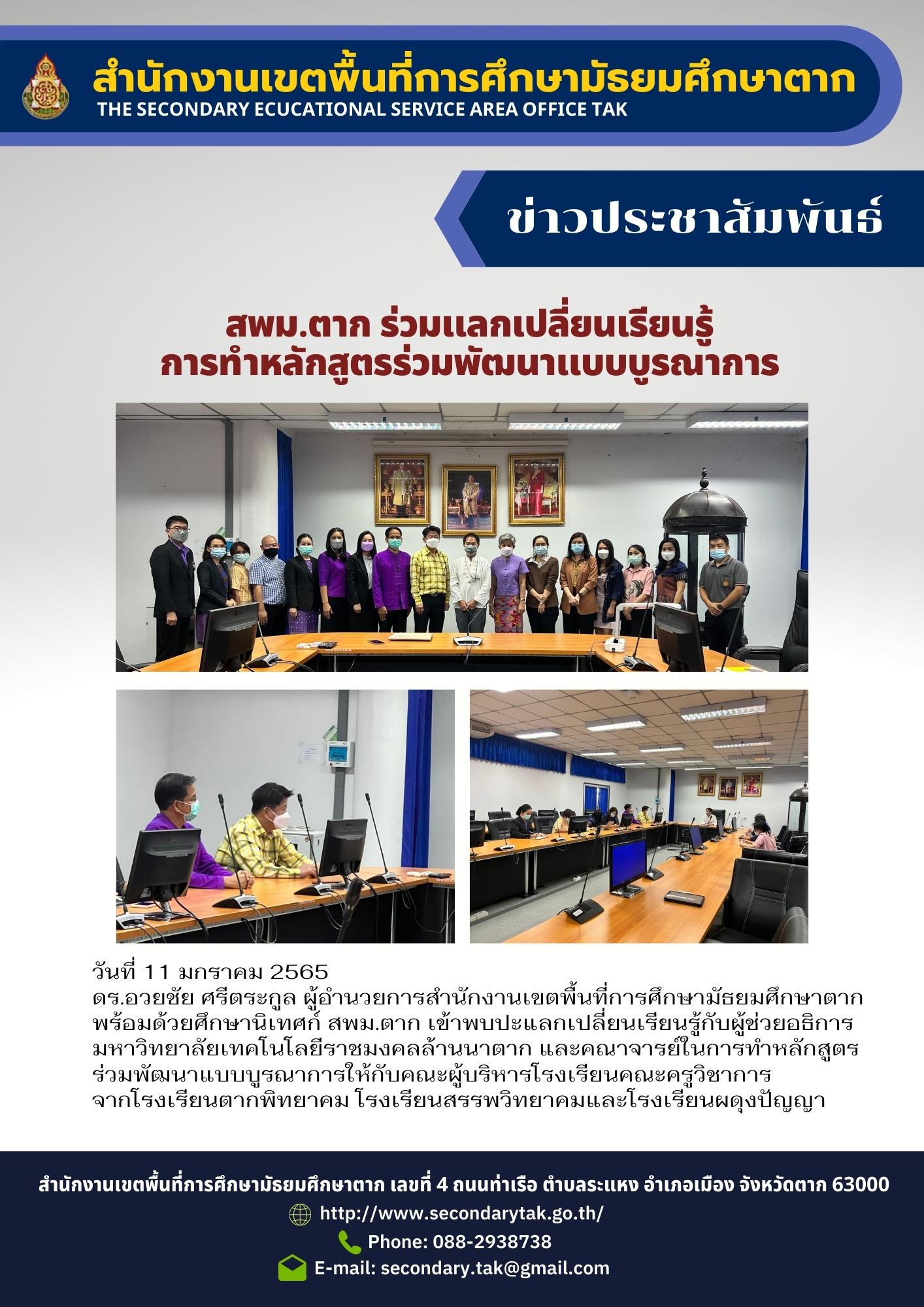 วันที่ 11 มกราคม 2565ดร.อวยชัย ศรีตระกูล ผู้อำนวยการสำนักงานเขตพื้นที่การศึกษามัธยมศึกษาตากพร้อมด้วยศึกษานิเทศก์ สพม.ตาก เข้าพบปะแลกเปลี่ยนเรียนรู้กับผู้ช่วยอธิการมหาวิทยาลัยเทคโนโลยีราชมงคลล้านนาตาก และคณาจารย์ในการทำหลักสูตรร่วมพัฒนาแบบบูรณาการให้กับคณะผู้บริหารโรงเรียนคณะครูวิชาการ จากโรงเรียนตากพิทยาคม โรงเรียนสรรพวิทยาคมและโรงเรียนผดุงปัญญา