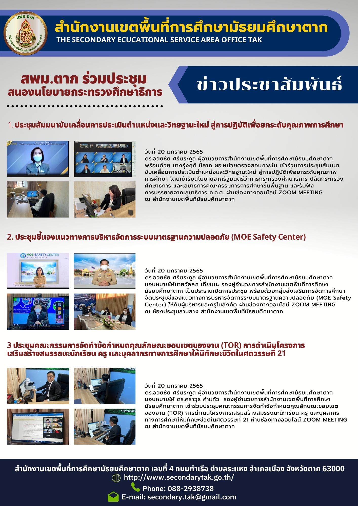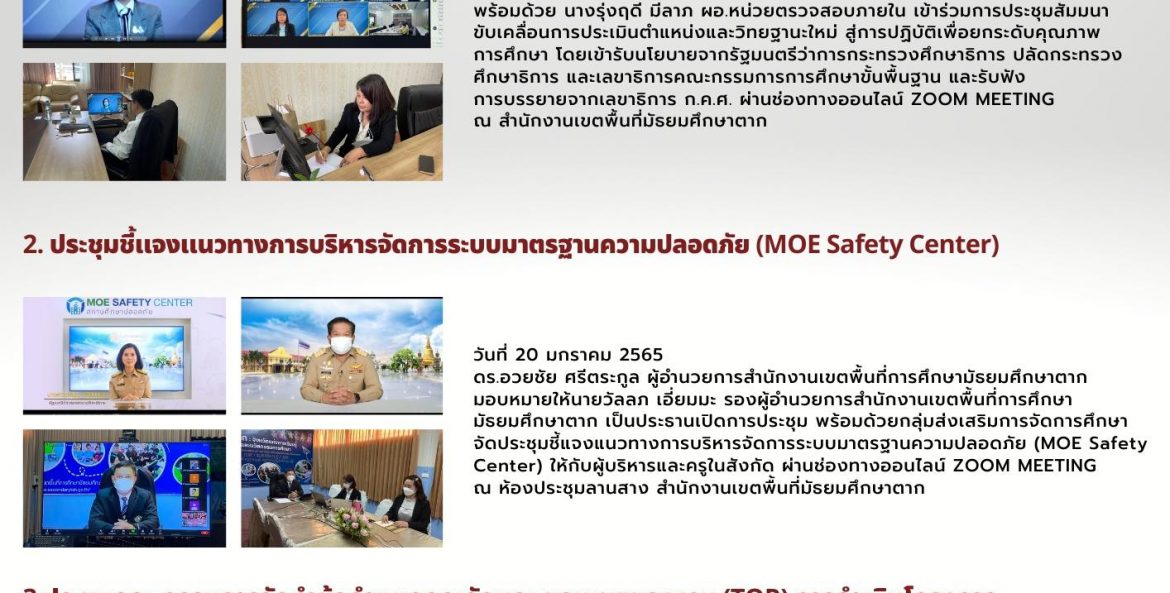 วันที่ 20 มกราคม 2565 ดร.อวยชัย ศรีตระกูล ผู้อำนวยการสำนักงานเขตพื้นที่การศึกษามัธยมศึกษาตาก มอบหมายให้นายวัลลภ เอี่ยมมะ รองผู้อำนวยการสำนักงานเขตพื้นที่การศึกษามัธยมศึกษาตาก เป็นประธานเปิดการประชุม พร้อมด้วยกลุ่มส่งเสริมการจัดการศึกษา จัดประชุมชี้แจงแนวทางการบริหารจัดการระบบมาตรฐานความปลอดภัย (MOE Safety Center) ให้กับผู้บริหารและครูในสังกัด ผ่านช่องทางออนไลน์ ZOOM MEETING ณ ห้องประชุมลานสาง สำนักงานเขตพื้นที่มัธยมศึกษาตาก
