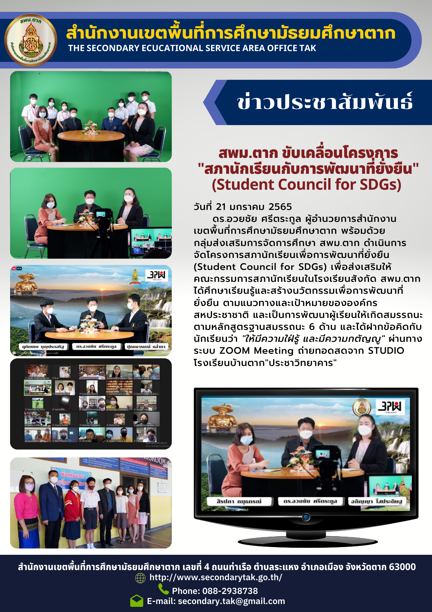 วันที่ 21 มกราคม 2565 ดร.อวยชัย ศรีตระกูล ผู้อำนวยการสำนักงานเขตพื้นที่การศึกษามัธยมศึกษาตาก พร้อมด้วย กลุ่มส่งเสริมการจัดการศึกษา สพม.ตาก ดำเนินการจัดโครงการสภานักเรียนเพื่อการพัฒนาที่ยั่งยืน (Student Council fro SDGs) เพื่อส่งเสริมให้คณะกรรมการสภานักเรียนในโรงเรียนสังกัด สพม.ตาก ได้ศึกษาเรียนรู้และสร้างนวัตกรรมเพื่อการพัฒนาที่ยั่งยืน ตามแนวทางและเป้าหมายขององค์กรสหประชาชาติ และเป็นการพัฒนาผู้เรียนให้เกิดสมรรถนะตามหลักสูตรฐานสมรรถนะ 6 ด้าน และได้ผากข้อคิดกับนักเรียนว่า “ให้มีความใฝ่รู้ และมีความกตัญญู” ผ่านทางระบบ ZOOM Meeting ถ่ายทอดสดจาก STUDIO โรงเรียนบ้านตาก”ประชาวิทยาคาร”