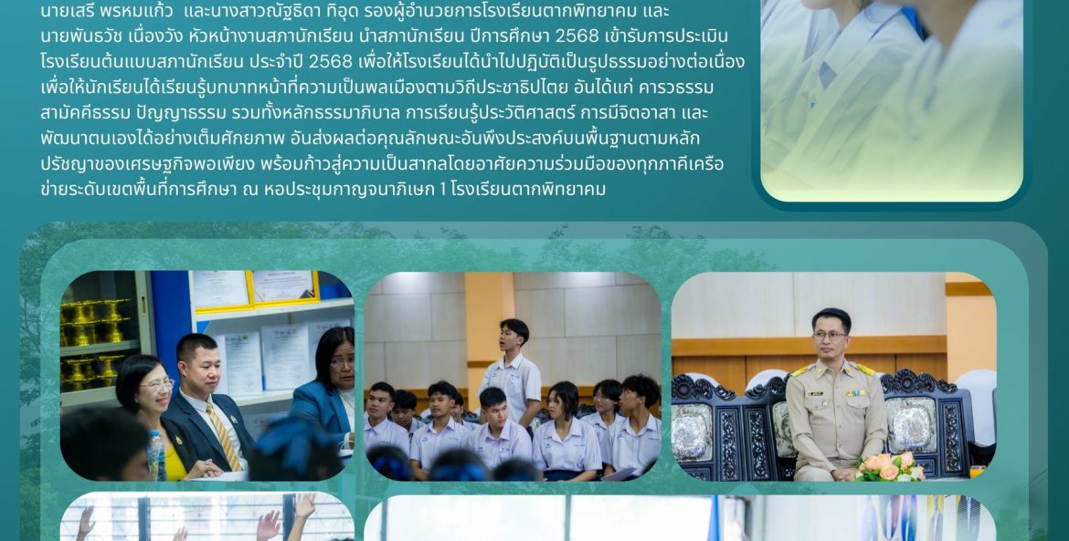 วันที่ 18 สิงหาคม พ.ศ. 2568 ดร.ภูธนภัส พุ่มไม้ ผู้อำนวยการโรงเรียนตากพิทยาคม พร้อมด้วยนายอภิศักดิ์ เทียมฉันท์ นายเสรี พรหมแก้ว และนางสาวณัฐธิดา ทิอุด รองผู้อำนวยการโรงเรียนตากพิทยาคม และนายพันธวัช เนื่องวัง หัวหน้างานสภานักเรียน นำสภานักเรียน ปีการศึกษา 2568 เข้ารับการประเมินโรงเรียนต้นแบบสภานักเรียน ประจำปี 2568 เพื่อให้โรงเรียนได้นำไปปฏิบัติเป็นรูปธรรมอย่างต่อเนื่อง เพื่อให้นักเรียนได้เรียนรู้บทบาทหน้าที่ความเป็นพลเมืองตามวิถีประชาธิปไตย อันได้แก่ คารวธรรม สามัคคีธรรม ปัญญาธรรม รวมทั้งหลักธรรม