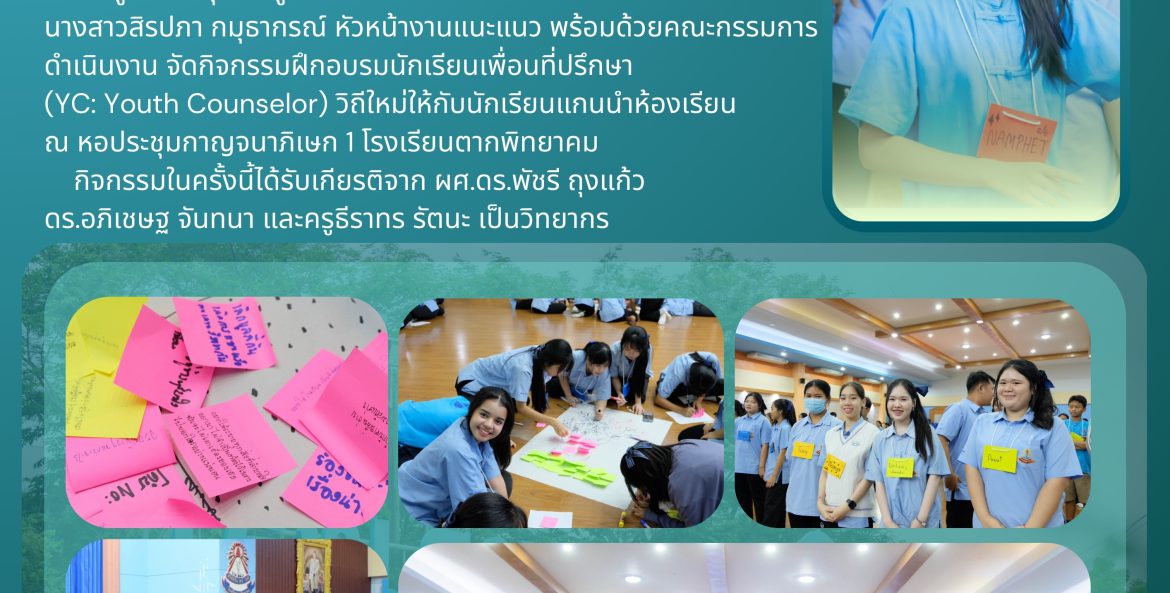 วันที่ 22 สิงหาคม พ.ศ. 2568 ดร.ภูธนภัส พุ่มไม้ ผู้อำนวยการโรงเรียนตากพิทยาคม มอบหมายให้นางสาวสิรปภา กมุธากรณ์ หัวหน้างานแนะแนว พร้อมด้วยคณะกรรมการดำเนินงาน จัดกิจกรรมฝึกอบรมนักเรียนเพื่อนที่ปรึกษา (YC: Youth Counselor) วิถีใหม่ให้กับนักเรียนแกนนำห้องเรียน ณ หอประชุมกาญจนาภิเษก 1 โรงเรียนตากพิทยาคม กิจกรรมในครั้งนี้ได้รับเกียรติจาก ผศ.ดร.พัชรี ถุงแก้ว, ดร.อภิเชษฐ จันทนา และครูธีราทร รัตนะ เป็นวิทยากร