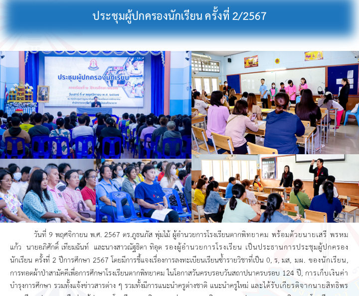 วันที่ 2 สิงหาคม พ.ศ. 2568 ดร.ภูธนภัส พุ่มไม้ ผู้อำนวยการโรงเรียนตากพิทยาคม มอบหมายให้นายเสรี พรหมแก้ว นายอภิศักดิ์ เทียมฉันท์ รองผู้อำนวยการโรงเรียน และคณะครูโรงเรียนตากพิทยาคม จัดการประชุมผู้ปกครองเครือข่าย และคณะศิษย์เก่าโรงเรียนตากพิทยาคม เพื่อปรึกษาหารือแนวทางนโยบายในการพัฒนาโรงเรียน ณ ห้องประชุมตากสิน โรงเรียนตากพิทยาคม