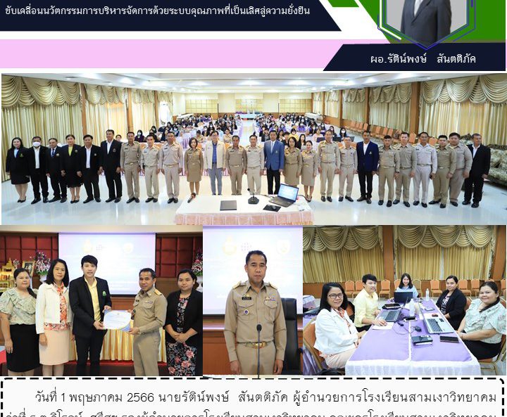 วันที่ 1 พฤษภาคม 2566 นายรัติน์พงษ์ สันตติภัค ผู้อำนวยการโรงเรียนสามเงาวิทยาคม ว่าที่ ร.ต.วิโรจน์ ศรีสุข รองผู้อำนวยการโรงเรียนสามเงาวิทยาคม คณะครูโรงเรียนสามเงาวิทยาคม เข้าร่วมการอบรมปฏิบัติการพัฒนาโรงเรียนสู่มาตรฐานสากล :ขับเคลื่อนนวัตกรรมการบริหารจัดการด้วยระบบคุณภาพที่เป็นเลิศสู่ความยั่งยืน โดยได้รับเกียรติจาก ส.ต.ต.นปดล นพเคราะห์ ผอ.สพม. ตาก เป็นประธานในพิธี ระหว่างวันที่ 1-2 พฤษภาคม 2566 ณ ห้องประชุมโรงเรียนสรรพวิทยาคม อำเภอแม่สอด จังหวัดตาก