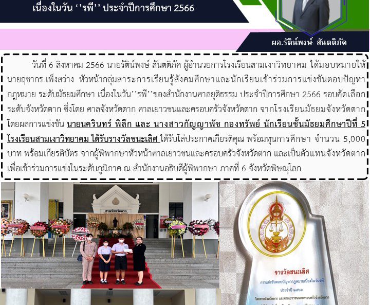 วันที่ 6 สิงหาคม 2566 นายรัติน์พงษ์ สันตติภัค ผู้อำนวยการโรงเรียนสามเงาวิทยาคม ได้มอบหมายให้นายฤชากร เพ็งสว่าง หัวหน้ากลุ่มสาระการเรียนรู้สังคมศึกษาและนักเรียนเข้าร่วมการแข่งขันตอบปัญหากฎหมาย ระดับมัธยมศึกษา เนื่องในวัน’’รพี’’ของสำนักงานศาลยุติธรรม ประจำปีการศึกษา 2566 รอบคัดเลือกระดับจังหวัดตาก ซึ่งโดย ศาลจังหวัดตาก ศาลเยาวชนและครอบครัวจังหวัดตาก จากโรงเรียนมัธยมจังหวัดตาก โดยผลการแข่งขัน นายนครินทร์ พิลึก และ นางสาวกัญญาพัช กองทรัพย์ นักเรียนชั้นมัธยมศึกษาปีที่ 5 โรงเรียนสามเงาวิทยาคม ได้รับร