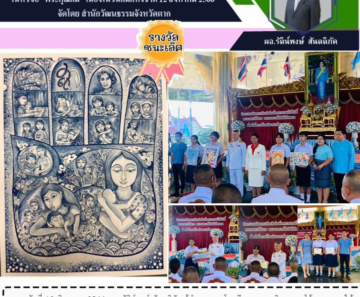 วันที่ 12 สิงหาคม 2566 นายรัติน์พงษ์ สันตติภัค ผู้อำนวยการโรงเรียนสามเงาวิทยาคม ได้มอบหมายให้ นายศักรินทร์ สืบสอน ครูกลุ่มสาระการเรียนรู้ศิลปะ ได้นำนักเรียนเข้ารับรางวัล ได้แก่ นางสาวอธิชา เข็มทอง นักเรียนชั้นมัธยมศึกษาปีที่ 5 ที่ได้เข้าร่วมการประกวดวาดภาพระบายสีน้ำ ในหัวข้อ “พระคุณแม่” เนื่องในวันแม่แห่งชาติ 12 สิงหาคม 2566 ระดับมัธยมศึกษาตอนปลาย ได้รับรางวัลชนะเลิศ รับมอบเกียรติบัตรและเงินรางวัล จาก นายสมชัย กิจเจริญรุ่งโรจน์ ผู้ว่าราชการจังหวัดตาก ณ หอกิตติคุณ อำเภอเมืองตาก จังหวัดตาก จัด