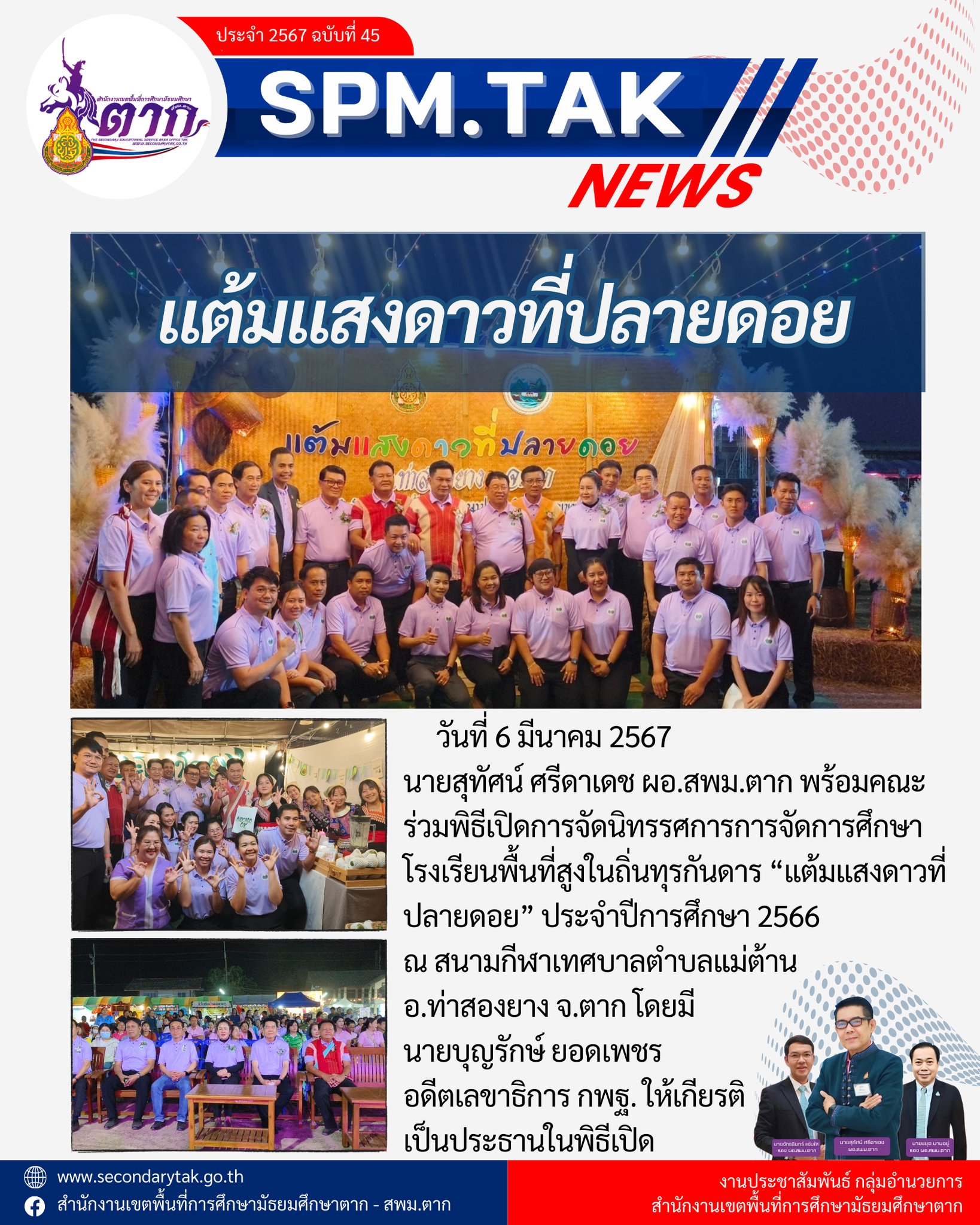 วันที่ 6 มีนาคม 2567นายสุทัศน์ ศรีดาเดช ผอ.สพม.ตาก พร้อมคณะร่วมพิธีเปิดการจัดนิทัศการการจัดการศึกษาโรงเรียนพื้นที่สูงในถิ่นทุรกันดาร “แต้มแสงดาวที่ปลายดอย” ประจำปีการศึกษา 2566 ณ สนามกีฬาเทศบาลแม่ต้าน อ.ท่าสองยาง จ.ตาก โดยมีนายบุญรักษ์ ยอดเพชร อดีตเลขาธิการ กพฐ. ให้เกียรติเป็นประธานในพิธีเปิด
