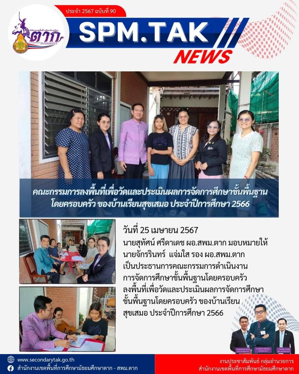 วันที่ 25 เมษายน 2567 นายสุทัศน์ ศรีดาเดช ผอ.สพม.ตาก มอบหมายให้นายจักรรินทร์ แจ่มใส รอง ผอ.สพม.ตาก เป็นประธานการคณะกรรมการดำเนินงานการจัดการศึกษาขั้นพื้นฐานโดยครอบครัวลงพื้นที่เพื่อวัดและประเมินผลการจัดการศึกษาขั้นพื้นฐานโดยครอบครัว ของบ้านเรียนสุขเสมอ ประจำปีการศึกษา 2566