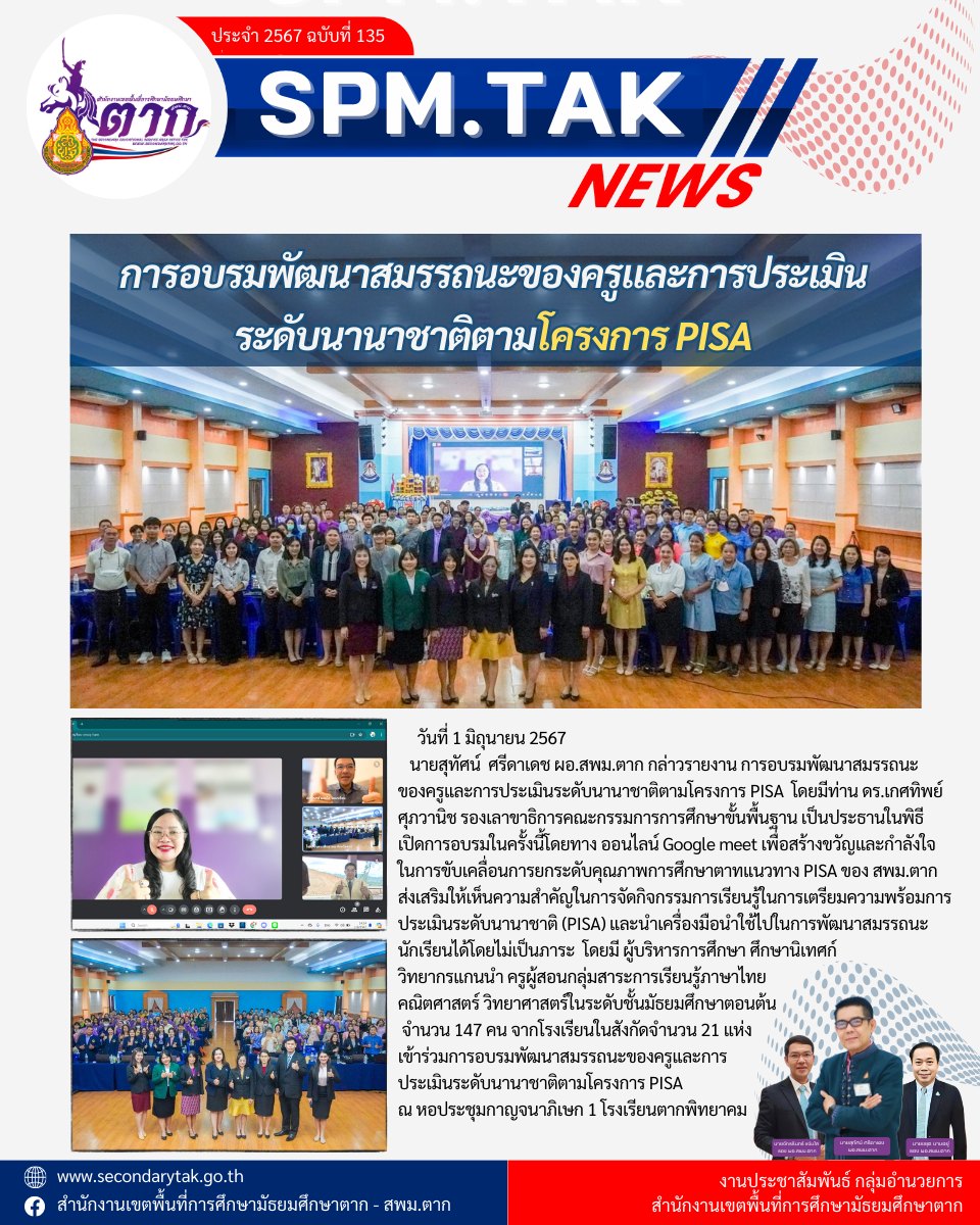 วันที่ 1 มิถุนายน 2567 นายสุทัศน์ ศรีดาเดช ผอ.สพม.ตาก กล่าวรายงาน การอบรมพัฒนาสมรรถนะของครูและการประเมินระดับนานาชาติตามโครงการ PISA โดยมีท่าน ดร.เกศทิพย์ ศุภวานิช รองเลาขาธิการคณะกรรมการการศึกษาขั้นพื้นฐาน เป็นประธานในพิธีเปิดการอบรมในครั้งนี้โดยทาง ออนไลน์ Google meet เพื่อสร้างขวัญและกำลังใจในการขับเคลื่อนการยกระดับคุณภาพการศึกษาตาทแนวทาง PISA ของ สพม.ตาก ส่งเสริมให้เห็นความสำคัญในการจัดกิจกรรมการเรียนรู้ในการเตรียมความพร้อมการประเมินระดับนานาชาติ (PISA) และนำเครื่องมือนำใช้ไปในการพัฒนาสมรรถนะนักเรียนได้โดยไม่เป็นภาระ โดยมี ผู้บริหารการศึกษา ศึกษานิเทศก์ วิทยากรแกนนำ ครูผู้สอนกลุ่มสาระการเรียนรู้ภาษาไทย คณิตศาสตร์ วิทยาศาสตร์ในระดับชั้นมัธยมศึกษาตอนต้น จำนวน 147 คน จากโรงเรียนในสังกัดจำนวน 21 แห่ง เข้าร่วมการอบรมพัฒนาสมรรถนะของครูและการประเมินระดับนานาชาติตามโครงการ PISA ณ หอประชุมกาญจนาภิเษก 1 โรงเรียนตากพิทยาคม