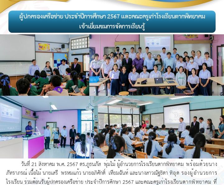 วันที่ 21 สิงหาคม พ.ศ. 2567 ดร.ภูธนภัส พุ่มไม้ ผู้อำนวยการโรงเรียนตากพิทยาคม พร้อมด้วยนางภัทราภรณ์ เนื้อไม้ นายเสรี พรหมแก้ว นายอภิศักดิ์ เทียมฉันท์ และนางสาวณัฐธิดา ทิอุด รองผู้อำนวยการโรงเรียน ร่วมต้อนรับผู้ปกครองเครือข่าย ประจำปีการศึกษา 2567 และคณะครูเก่าโรงเรียนตากพิทยาคม ที่เข้าเยี่ยมชมการจัดการเรียนการสอนของนักเรียนทุกระดับชั้น รวมถึงสภาพแวดล้อมในโรงเรียน เพื่อเป็นแนวทางสร้างความเข้าใจอันดีร่วมกัน และสะท้อนแนวคิดเพื่อนำมาพัฒนาโรงเรียนให้ดียิ่งขึ้น ณ โรงเรียนตากพิทยาคม จังหวัดตาก