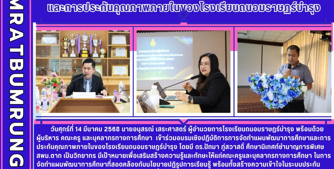 วันศุกร์ที่ 14 มีนาคม 2568 นายอนุสรณ์ เสระศาสตร์ ผู้อำนวยการโรงเรียนถนอมราษฎร์บำรุง พร้อมด้วย ผู้บริหาร คณะครู และบุคลากรทางการศึกษา เข้าร่วมอบรมเชิงปฏิบัติการการจัดทำแผนพัฒนาการศึกษาและการประกันคุณภาพภายในของโรงเรียนถนอมราษฏร์บำรุง โดยมี ดร.ปัทมา ภู่สวาสดิ์ ศึกษานิเทศก์ชำนาญการพิเศษ สพม.ตาก เป็นวิทยากร มีเป้าหมายเพื่อเสริมสร้างความรู้และทักษะให้แก่คณะครูและบุคลากรทางการศึกษา ในการจัดทำแผนพัฒนาการศึกษาที่สอดคล้องกับนโยบายปฏิรูปการเรียนรู้ พร้อมทั้งสร้างความเข้าใจในระบบประกันคุณภาพภายในตามมาตรฐานการศึกษาชาติ เพื่อให้โรงเรียนสามารถพัฒนาคุณภาพการจัดการศึกษาได้อย่างเป็นระบบและยั่งยืน ณ โรงเรียนถนอมราษฎร์บำรุง