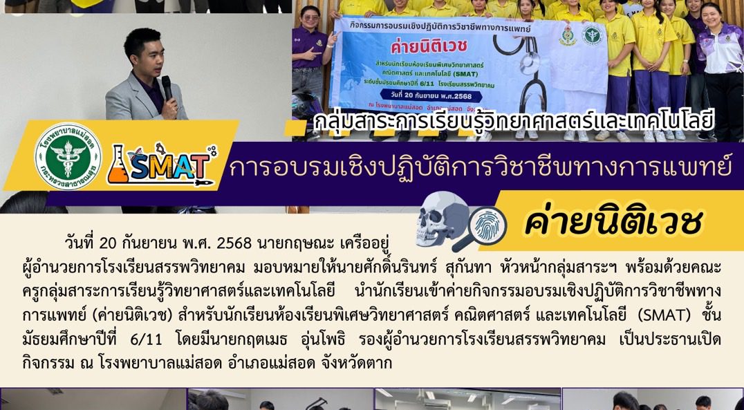 โรงเรียนสรรพวิทยาคม : ผู้อำนวยการโรงเรียนสรรพวิทยาคม มอบหมายให้นายศักดิ์นรินทร์ สุกันทา หัวหน้ากลุ่มสาระฯ พร้อมด้วยคณะ ครูกลโรงเรียนสรรพวิทยาคม : กิจกรรมอบรมเชิงปฏิบัติการวิชาชีพทาง การแพทย์ (ค่ายนิติเวช) สำหรับนักเรียนห้องเรียนพิเศษวิทยาศาสตร์ คณิตศาสตร์ และเทคโนโลยี (SMAT) นิรมล พิพัฒน์คุปติกุล 21 กันยายน 2568 อ่านเพิ่มเติม