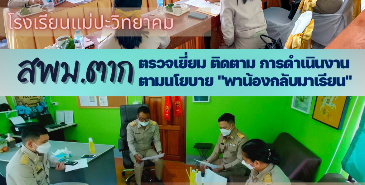 วันที่ 14 กุมภาพันธ์ 2565 ดร.อวยชัย ศรีตระกูล ผอ.สพม.ตาก มอบหมายให้ นายวัลลภ เอี่ยมมะ รอง ผอ.สพม.ตาก พร้อมด้วย นางสุภัทร เงินดี ผอ.รร.สรรพวิทยาคม ตรวจเยี่ยม ติดตาม การดำเนินงานตามนโยบาย “พาน้องกลับมาเรียน” โรงเรียนแม่ปะวิทยาคม โรงเรียนแม่จะเราวิทยาคม ตามนโยบายรัฐมนตรีว่าการกระทรวงศึกษาธิการ เพื่อให้การดำเนินงานสำเร็จเป็นรูปธรรม โดยมีนางศรีรัตน์ อินทนุ ผอ.รร.แม่ปะวิทยาคม พร้อมคณะครู และนายจิระวิน พุ่มนวล ผอ.รร.แม่จะเราวิทยาคม พร้อม คณะครู เข้าร่วมการติดตามตามลำดับ