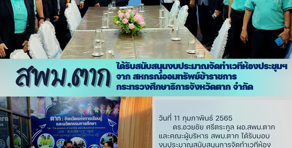 ดร.อวยชัย ศรีตระกูล ผอ.สพม.ตาก และคณะผู้บริหาร สพม.ตาก ได้รับมอบ งบประมาณสนับสนุนการจัดทำเวทีห้องประชุม สพม.ตาก จากสหกรณ์ออมทรัพย์ข้าราชการกระทรวงศึกษาธิการจังหวัดตาก จำกัด โดยนายสมศักดิ์ เลิศรัตนพันธุ์ ประธานกรรมการสหกรณ์ออมทรัพย์ฯ เพื่อใช้ในการบริหารและบริการกับข้าราชการครูและบุคลากรทางการศึกษา ให้สามารถใช้งานอย่างเต็มรูปแบบและเหมาะสมต่อไป ณ ห้องประชุมลานสาง สพม.ตาก