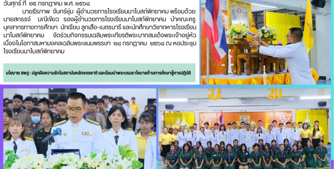 วันศุกร์ ที่ ๒๕ กรกฎาคม พ.ศ. ๒๕๖๘ นายธีรภาพ จันทร์ชุ่ม ผู้อำนวยการโรงเรียนนาโบสถ์พิทยาคม พร้อมด้วยนายสกรรจ์ มณีเขียว รองผู้อำนวยการโรงเรียนนาโบสถ์พิทยาคม นำคณะครูบุคลากรทางการศึกษา นักเรียน ลูกเสือ-เนตรนารี และนักศึกษาวิชาทหารโรงเรียนนาโบสถ์พิทยาคม จัดร่วมกิจกรรมเฉลิมพระเกียรติพระบาทสมเด็จพระเจ้าอยู่หัวเนื่องในโอกาสมหามงคลเฉลิมพระชนมพรรษา ๒๘ กรกฎาคม ๒๕๖๘ ณ หอประชุมโรงเรียนนาโบสถ์พิทยาคม