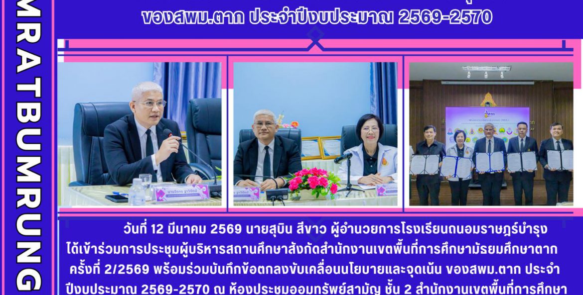 วันที่ 12 มีนาคม 2569 นายสุบิน สีขาว ผู้อำนวยการโรงเรียนถนอมราษฎร์บำรุง ได้เข้าร่วมการประชุมผู้บริหารสถานศึกษาสังกัดสำนักงานเขตพื้นที่การศึกษามัธยมศึกษาตาก ครั้งที่ 2/2569 พร้อมร่วมบันทึกข้อตกลงขับเคลื่อนนโยบายและจุดเน้น ของสพม.ตาก ประจำปีงบประมาณ 2569-2570 ณ ห้องประชุมออมทรัพย์สามัญ ชั้น 2 สำนักงานเขตพื้นที่การศึกษามัธยมศึกษาตาก อำเภอเมือง จังหวัดตาก ภาพ : ประชาสัมพันธ์ สพม.ตาก