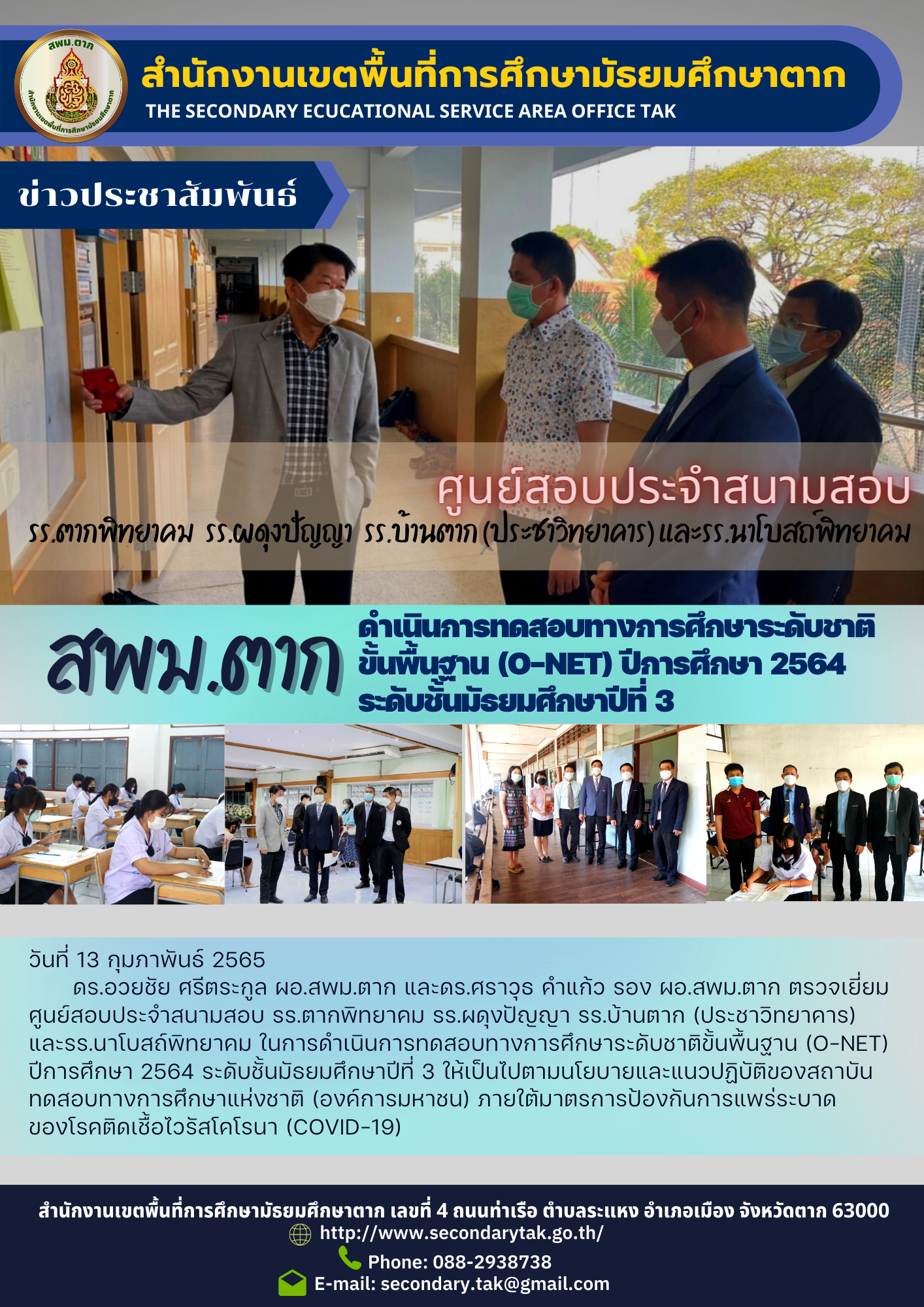 วันที่ 13 กุมภาพันธ์ 2565 ดร.อวยชัย ศรีตระกูล ผอ.สพม.ตาก และดร.ศราวุธ คำแก้ว รอง ผอ.สพม.ตาก ตรวจเยี่ยมศูนย์สอบประจำสนามสอบ รร.ตากพิทยาคม รร.ผดุงปัญญา รร.บ้านตาก (ประชาวิทยาคาร) และรร.นาโบสถ์พิทยาคม ในการดำเนินการทดสอบทางการศึกษาระดับชาติขั้นพื้นฐาน (O-NET) ปีการศึกษา 2564 ระดับชั้นมัธยมศึกษาปีที่ 3 ให้เป็นไปตามนโยบายและแนวปฏิบัติของสถาบันทดสอบทางการศึกษาแห่งชาติ (องค์การมหาชน) ภายใต้มาตรการป้องกันการแพร่ระบาดของโรคติดเชื้อไวรัสโคโรนา (COVID-19)