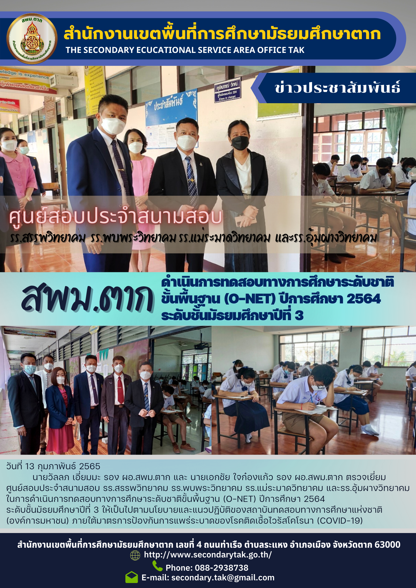 วันที่ 13 กุมภาพันธ์ 2565 นายวัลลภ เอี่ยมมะ รอง ผอ.สพม.ตาก และ นายเอกชัย ใจก๋องแก้ว รอง ผอ.สพม.ตาก ตรวจเยี่ยมศูนย์สอบประจำสนามสอบ รร.สรรพวิทยาคม รร.พบพระวิทยาคม รร.แม่ระมาดวิทยาคม และรร.อุ้มผางวิทยาคม ในการดำเนินการทดสอบทางการศึกษาระดับชาติขั้นพื้นฐาน (O-NET) ปีการศึกษา 2564 ระดับชั้นมัธยมศึกษาปีที่ 3 ให้เป็นไปตามนโยบายและแนวปฏิบัติของสถาบันทดสอบทางการศึกษาแห่งชาติ (องค์การมหาชน) ภายใต้มาตรการป้องกันการแพร่ระบาดของโรคติดเชื้อไวรัสโคโรนา (COVID-19)