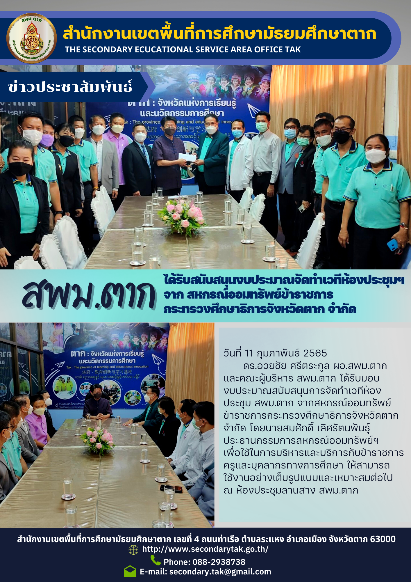 ดร.อวยชัย ศรีตระกูล ผอ.สพม.ตาก และคณะผู้บริหาร สพม.ตาก ได้รับมอบ งบประมาณสนับสนุนการจัดทำเวทีห้องประชุม สพม.ตาก จากสหกรณ์ออมทรัพย์ข้าราชการกระทรวงศึกษาธิการจังหวัดตาก จำกัด โดยนายสมศักดิ์ เลิศรัตนพันธุ์ ประธานกรรมการสหกรณ์ออมทรัพย์ฯ เพื่อใช้ในการบริหารและบริการกับข้าราชการครูและบุคลากรทางการศึกษา ให้สามารถใช้งานอย่างเต็มรูปแบบและเหมาะสมต่อไป ณ ห้องประชุมลานสาง สพม.ตาก
