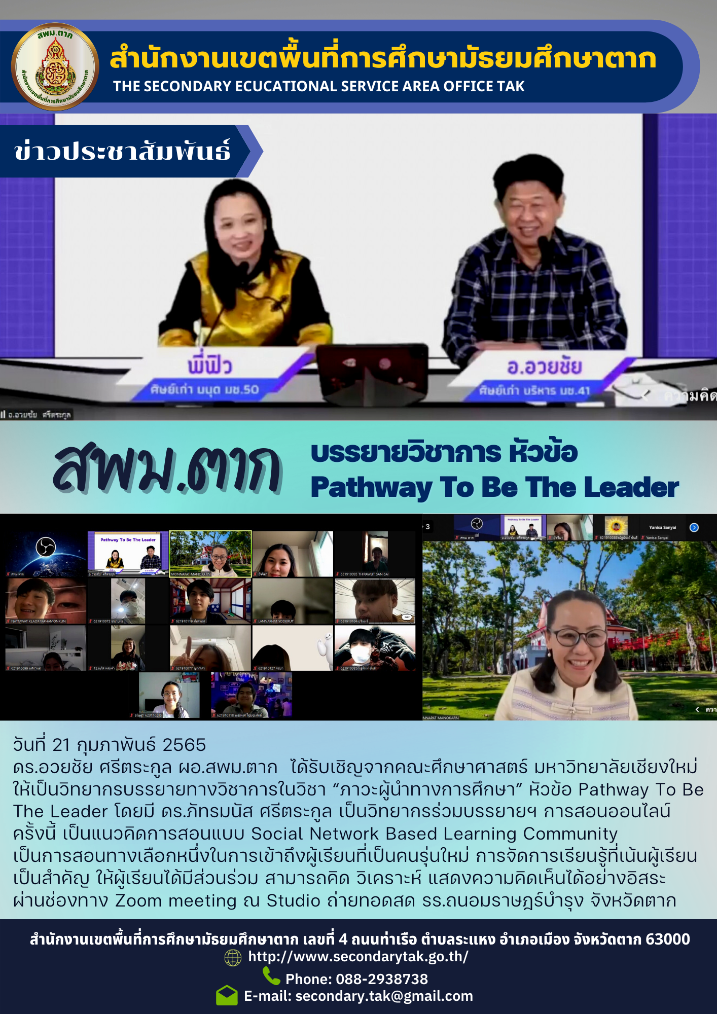 วันที่ 21 กุมภาพันธ์ 2565 ดร.อวยชัย ศรีตระกูล ผอ.สพม.ตาก ได้รับเชิญจากคณะศึกษาศาสตร์ มหาวิทยาลัยเชียงใหม่ ให้เป็นวิทยากรบรรยายทางวิชาการในวิชา “ภาวะผู้นำทางการศึกษา” หัวข้อ Pathway To Be The Leader โดยมี ดร.ภัทรมนัส ศรีตระกูล เป็นวิทยากรร่วมบรรยายฯ การสอนออนไลน์ ครั้งนี้ เป็นแนวคิดการสอนแบบ Social Network Based Learning Community เป็นการสอนทางเลือกหนึ่งในการเข้าถึงผู้เรียนที่เป็นคนรุ่นใหม่ การจัดการเรียนรู้ที่เน้นผู้เรียน เป็นสำคัญ ให้ผู้เรียนได้มีส่วนร่วม สามารถคิด วิเคราะห์ แสดงความคิดเห็นได้อย่างอิสระ ผ่านช่องทาง Zoom meeting ณ Studio ถ่ายทอดสด รร.ถนอมราษฎร์บำรุง จังหวัดตาก