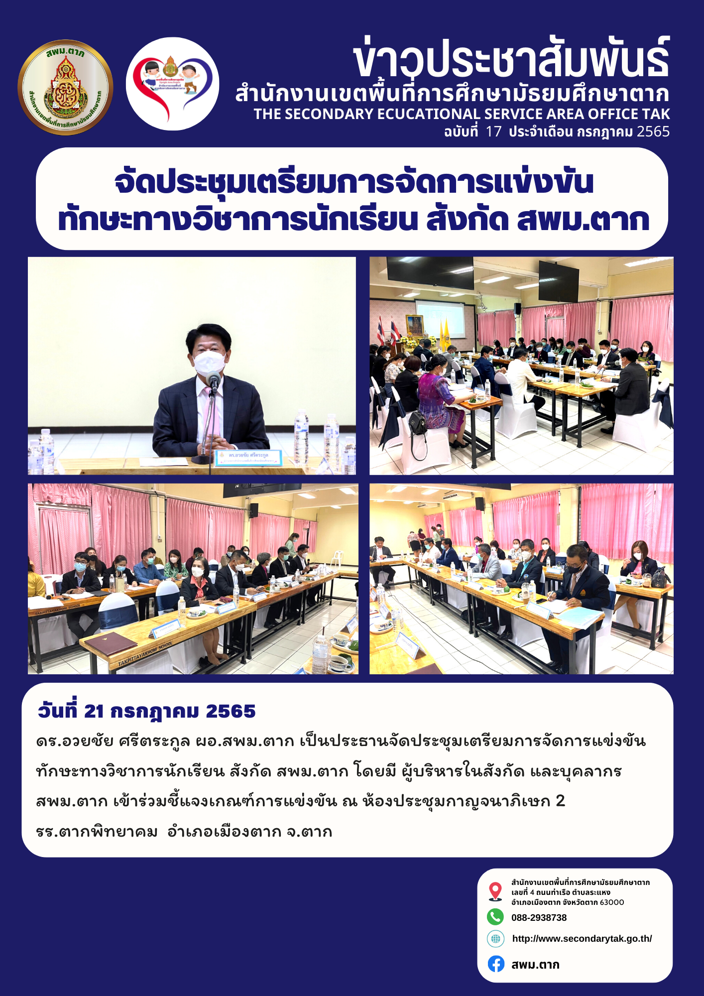 วันที่ 21 กรกฎาคม 2565 ดร.อวยชัย ศรีตระกูล ผอ.สพม.ตาก เป็นประธานจัดประชุมเตรียมการจัดการแข่งขันทักษะทางวิชาการนักเรียน สังกัด สพม.ตาก โดยมี ผู้บริหารในสังกัด และบุคลากร สพม.ตาก เข้าร่วมชี้แจงเกณฑ์การแข่งขัน ณ ห้องประชุมกาญจนาภิเษก 2