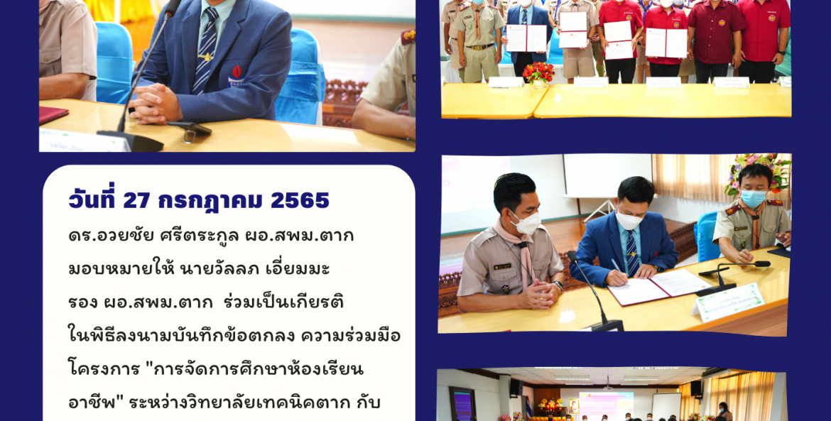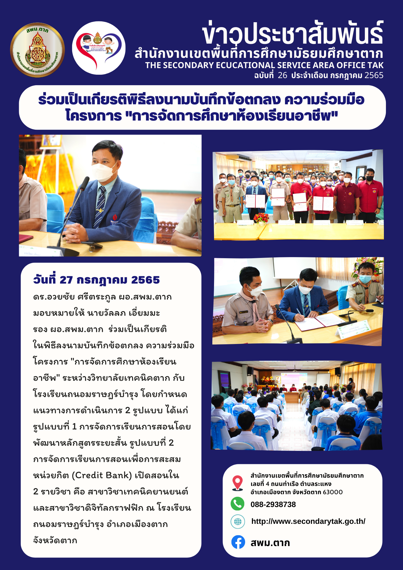 27 กรกฎาคม 2565 ดร.อวยชัย ศรีตระกูล ผอ.สพม.ตาก มอบหมายให้ นายวัลลภ เอี่ยมมะ รอง ผอ.สพม.ตาก ร่วมเป็นเกียรติในพิธีลงนามบันทึกข้อตกลง ความร่วมมือ โครงการ “การจัดการศึกษาห้องเรียนอาชีพ” ระหว่างวิทยาลัยเทคนิคตาก กับ โรงเรียนถนอมราษฎร์บำรุง โดยกำหนดแนวทางการดำเนินการ 2 รูปแบบ ได้แก่ รูปแบบที่ 1 การจัดการเรียนการสอนโดยพัฒนาหลักสูตรระยะสั้น รูปแบบที่ 2 การจัดการเรียนการสอนเพื่อการสะสมหน่วยกิต (Credit Bank) เปิดสอนใน 2 รายวิชา คือ สาขาวิชาเทคนิคยานยนต์ และสาขาวิชาดิจิทัลกราฟฟิก ณ โรงเรียนถนอมราษฎร์บำรุง อำเภอเมืองตาก จังหวัดตาก
