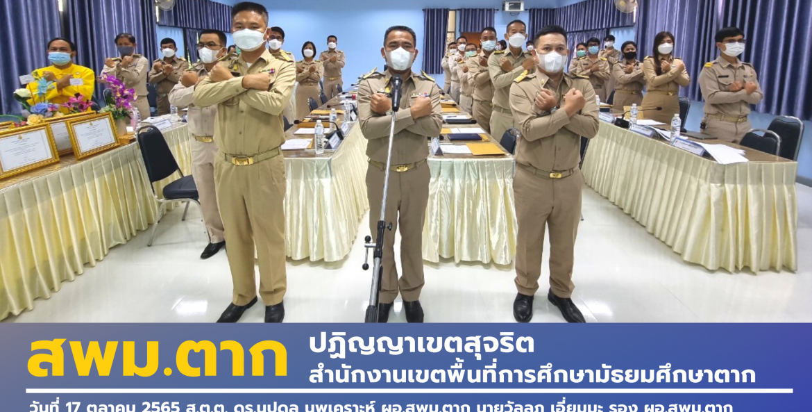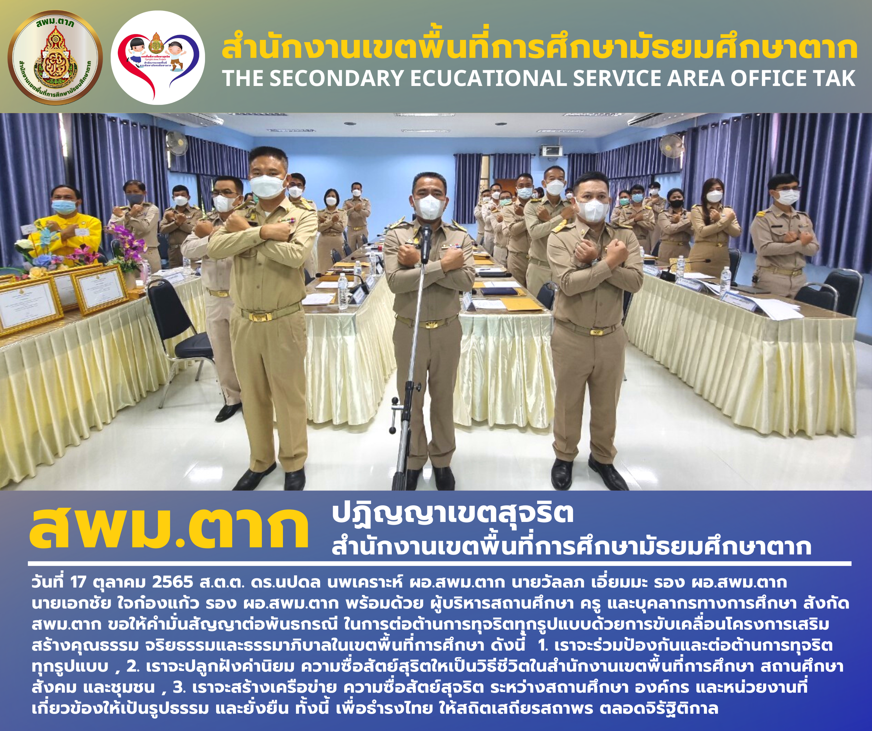 วันที่ 17 ตุลาคม 2565 ส.ต.ต. ดร.นปดล นพเคราะห์ ผอ.สพม.ตาก นายวัลลภ เอี่ยมมะ รอง ผอ.สพม.ตาก นายเอกชัย ใจก๋องแก้ว รอง ผอ.สพม.ตาก พร้อมด้วย ผู้บริหารสถานศึกษา ครู และบุคลากรทางการศึกษา สังกัด สพม.ตาก ขอให้คำมั่นสัญญาต่อพันธกรณี ในการต่อต้านการทุจริตทุกรูปแบบด้วยการขับเคลื่อนโครงการเสริมสร้างคุณธรรม จริยธรรมและธรรมาภิบาลในเขตพื้นที่การศึกษา ดังนี้ 1. เราจะร่วมป้องกันและต่อต้านการทุจริต ทุกรูปแบบ , 2. เราจะปลูกฝังค่านิยม ความซื่อสัตย์สุริตใหเป็นวิธีชีวิตในสำนักงานเขตพื้นที่การศึกษา สถานศึกษา สังคม และชุมชน , 3. เราจะสร้างเครือข่าย ความซื่อสัตย์สุจริต ระหว่างสถานศึกษา องค์กร และหน่วยงานที่ เกี่ยวข้องให้เป้นรูปธรรม และยั่งยืน ทั้งนี้ เพื่อธำรงไทย ให้สถิตเสถียรสถาพร ตลอดจิรัฐิติกาล