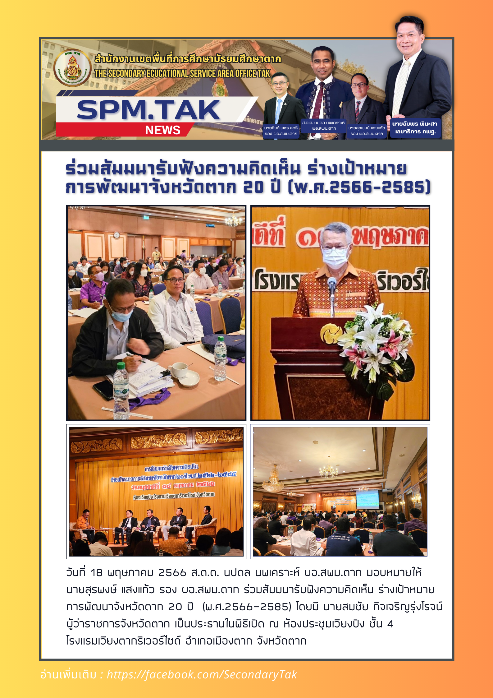 วันที่ 18 พฤษภาคม 2566 ส.ต.ต. นปดล นพเคราะห์ ผอ.สพม.ตาก มอบหมายให้ นายสุรพงษ์ แสงแก้ว รอง ผอ.สพม.ตาก ร่วมสัมมนารับฟังความคิดเห็น ร่างเป้าหมาย การพัฒนาจังหวัดตาก 20 ปี (พ.ศ.2566-2585) โดยมี นายสมชัย กิจเจริญรุ่งโรจน์ ผู้ว่าราชการจังหวัดตาก เป็นประธานในพิธีเปิด ณ ห้องประชุมเวียงปิง ชั้น 4 โรงเเรมเวียงตากริเวอร์ไซด์ อำเภอเมืองตาก จังหวัดตาก