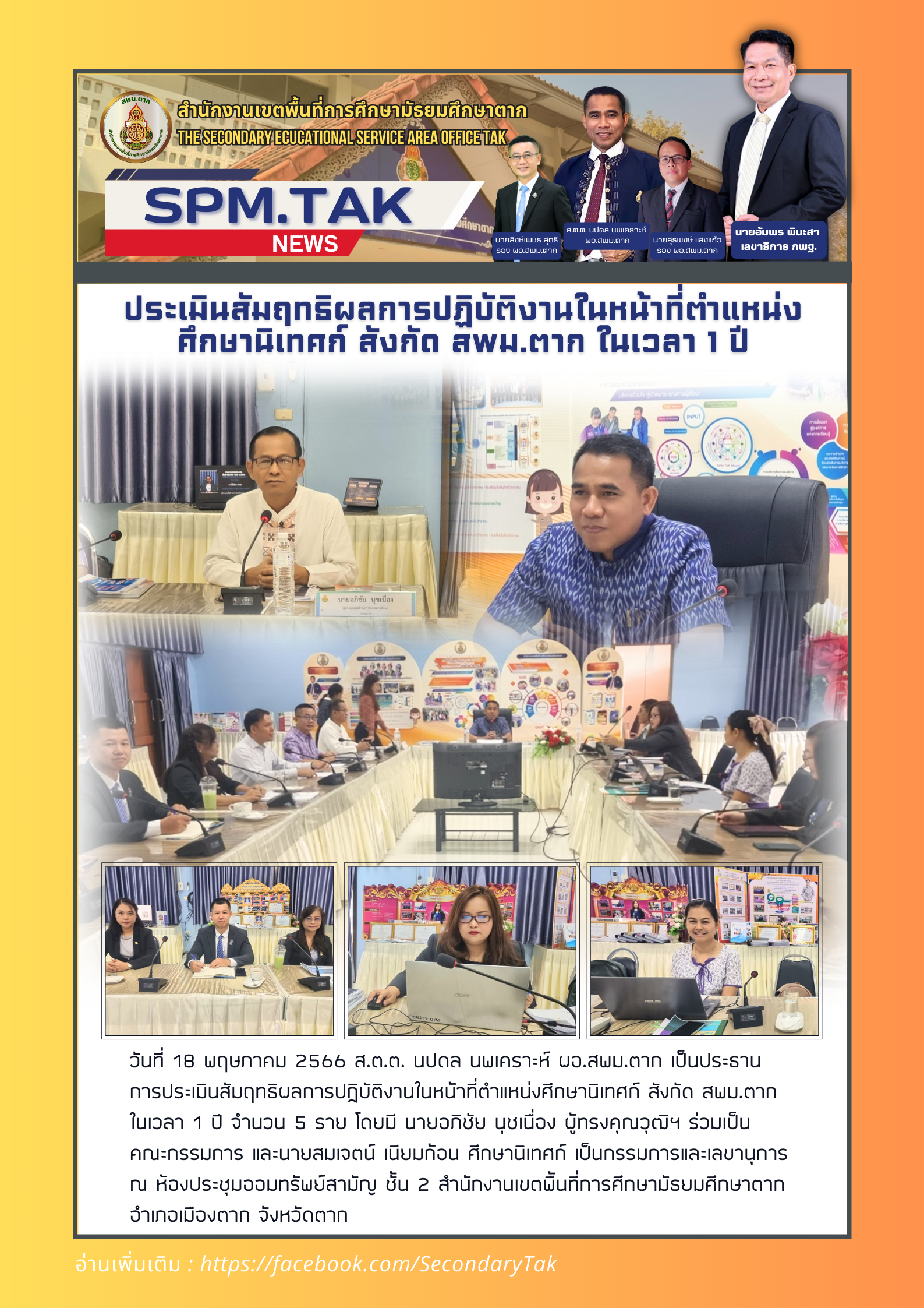 วันที่ 18 พฤษภาคม 2566 ส.ต.ต. นปดล นพเคราะห์ ผอ.สพม.ตาก เป็นประธาน การประเมินสัมฤทธิผลการปฏิบัติงานในหน้าที่ตำแหน่งศึกษานิเทศก์ สังกัด สพม.ตาก ในเวลา 1 ปี จำนวน 5 ราย โดยมี นายอภิชัย นุชเนื่อง ผู้ทรงคุณวุฒิฯ ร่วมเป็น คณะกรรมการ และนายสมเจตน์ เนียมก้อน ศึกษานิเทศก์ เป็นกรรมการและเลขานุการ ณ ห้องประชุมออมทรัพย์สามัญ ชั้น 2 สำนักงานเขตพื้นที่การศึกษามัธยมศึกษาตาก อำเภอเมืองตาก จังหวัดตาก