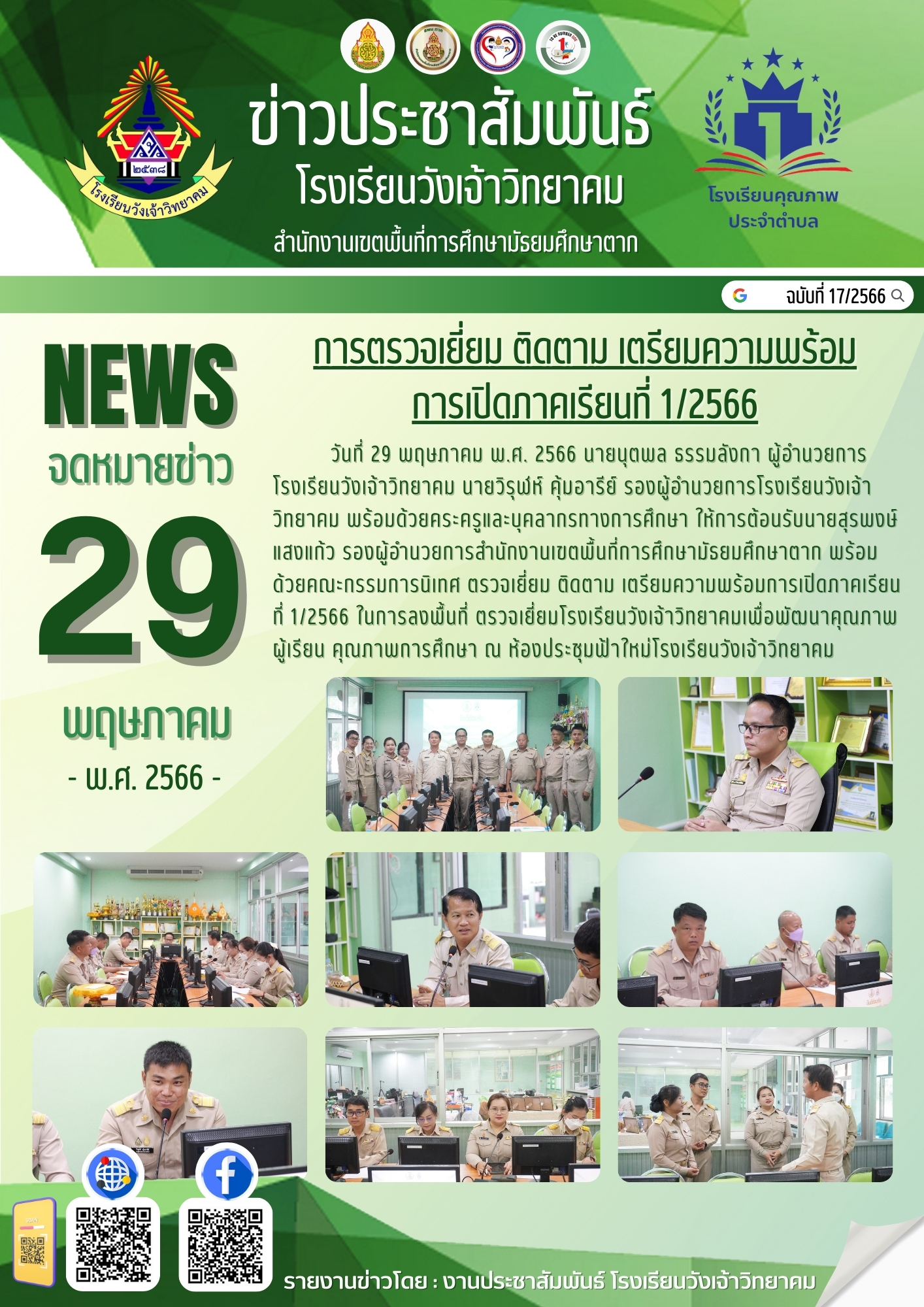 วันที่ 29 พฤษภาคม พ.ศ. 2566 นายนุตพล ธรรมลังกา ผู้อำนวยการโรงเรียนวังเจ้าวิทยาคม นายวิรุฬห์ คุ้มอารีย์ รองผู้อำนวยการโรงเรียนวังเจ้าวิทยาคมพร้อมด้วยคระครูและบุคลากรทางการศึกษา ให้การต้อนรับนายสุรพงษ์ แสงแก้ว รองผู้อำนวยการสำนักงานเขตพื้นที่การศึกษามัธยมศึกษาตาก พร้อมด้วยคณะกรรมการนิเทศ ตรวจเยี่ยม ติดตาม เตรียมความพร้อมการเปิดภาคเรียนที่ 1/2566 ในการลงพื้นที่ ตรวจเยี่ยมโรงเรียนวังเจ้าวิทยาคมเพื่อพัฒนาคุณภาพผู้เรียน คุณภาพการศึกษา ณ ห้องประชุมฟ้าใหม่โรงเรียนวังเจ้าวิทยาคม