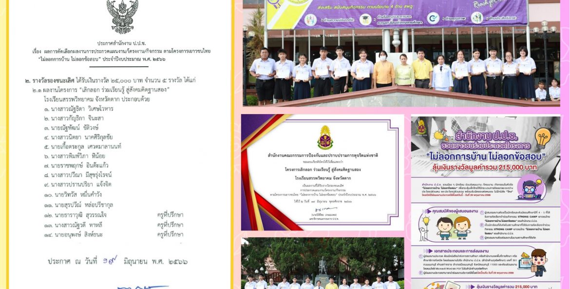 โรงเรียนสรรพวิทยาคม : รองชนะเลิศอันดับ ๑ ระดับประเทศ ารประกวดผลงานตามโครงการเยาวชนไทย “ไม่ลอกการบ้าน ไม่ลอกข้อสอบ” จาก สำนักงาน ป.ป. นิรมล พิพัฒน์คุปติกุล 30 กรกฎาคม 2566 จำนวนคนดู 15