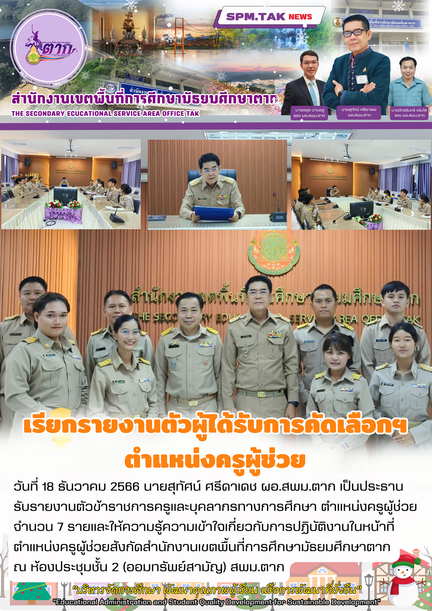 วันที่ 18 ธันวาคม 2566 นายสุทัศน์ ศรีดาเดช ผอ.สพม.ตาก เป็นประธาน รับรายงานตัวข้าราชการครูและบุคลากรทางการศึกษา ตำแหน่งครูผู้ช่วยจำนวน 7 รายและให้ความรู้ความเข้าใจเกี่ยวกับการปฏิบัติงานในหน้าที่ตำแหน่งครูผู้ช่วยสังกัดสำนักงานเขตพื้นที่การศึกษามัธยมศึกษาตาก ณ ห้องประชุมชั้น 2 (ออมทรัพย์สามัญ) สพม.ตาก