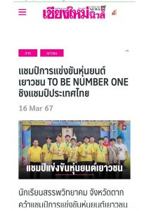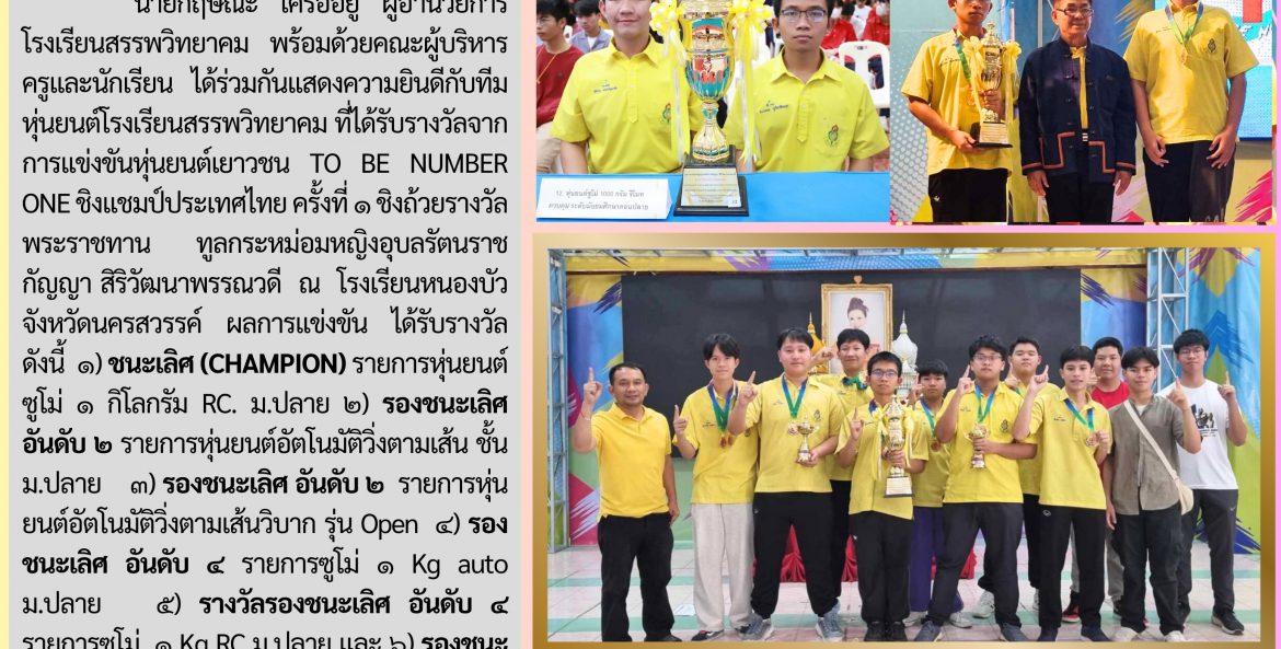 โรงเรียนสรรพวิทยาคม : คว้าแชมป์การแข่งขันหุ่นยนต์เยาวชน TO BE NUMBER ONE ชิงแชมป์ประเทศไทย ครั้งที่ ๑ ปีการศึกษา ๒๕๖๖ นิรมล พิพัฒน์คุปติกุล 17 มีนาคม 2567 จำนวนคนดู 7