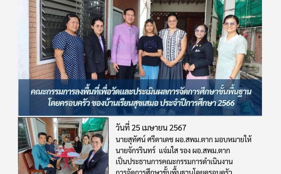 วันที่ 25 เมษายน 2567 นายสุทัศน์ ศรีดาเดช ผอ.สพม.ตาก มอบหมายให้นายจักรรินทร์ แจ่มใส รอง ผอ.สพม.ตาก เป็นประธานการคณะกรรมการดำเนินงานการจัดการศึกษาขั้นพื้นฐานโดยครอบครัวลงพื้นที่เพื่อวัดและประเมินผลการจัดการศึกษาขั้นพื้นฐานโดยครอบครัว ของบ้านเรียนสุขเสมอ ประจำปีการศึกษา 2566