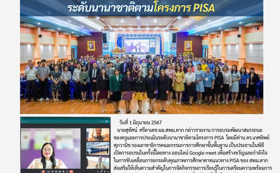 วันที่ 1 มิถุนายน 2567 นายสุทัศน์ ศรีดาเดช ผอ.สพม.ตาก กล่าวรายงาน การอบรมพัฒนาสมรรถนะของครูและการประเมินระดับนานาชาติตามโครงการ PISA โดยมีท่าน ดร.เกศทิพย์ ศุภวานิช รองเลาขาธิการคณะกรรมการการศึกษาขั้นพื้นฐาน เป็นประธานในพิธีเปิดการอบรมในครั้งนี้โดยทาง ออนไลน์ Google meet เพื่อสร้างขวัญและกำลังใจในการขับเคลื่อนการยกระดับคุณภาพการศึกษาตาทแนวทาง PISA ของ สพม.ตาก ส่งเสริมให้เห็นความสำคัญในการจัดกิจกรรมการเรียนรู้ในการเตรียมความพร้อมการประเมินระดับนานาชาติ (PISA) และนำเครื่องมือนำใช้ไปในการพัฒนาสมรรถนะนักเรียนได้โดยไม่เป็นภาระ โดยมี ผู้บริหารการศึกษา ศึกษานิเทศก์ วิทยากรแกนนำ ครูผู้สอนกลุ่มสาระการเรียนรู้ภาษาไทย คณิตศาสตร์ วิทยาศาสตร์ในระดับชั้นมัธยมศึกษาตอนต้น จำนวน 147 คน จากโรงเรียนในสังกัดจำนวน 21 แห่ง เข้าร่วมการอบรมพัฒนาสมรรถนะของครูและการประเมินระดับนานาชาติตามโครงการ PISA ณ หอประชุมกาญจนาภิเษก 1 โรงเรียนตากพิทยาคม