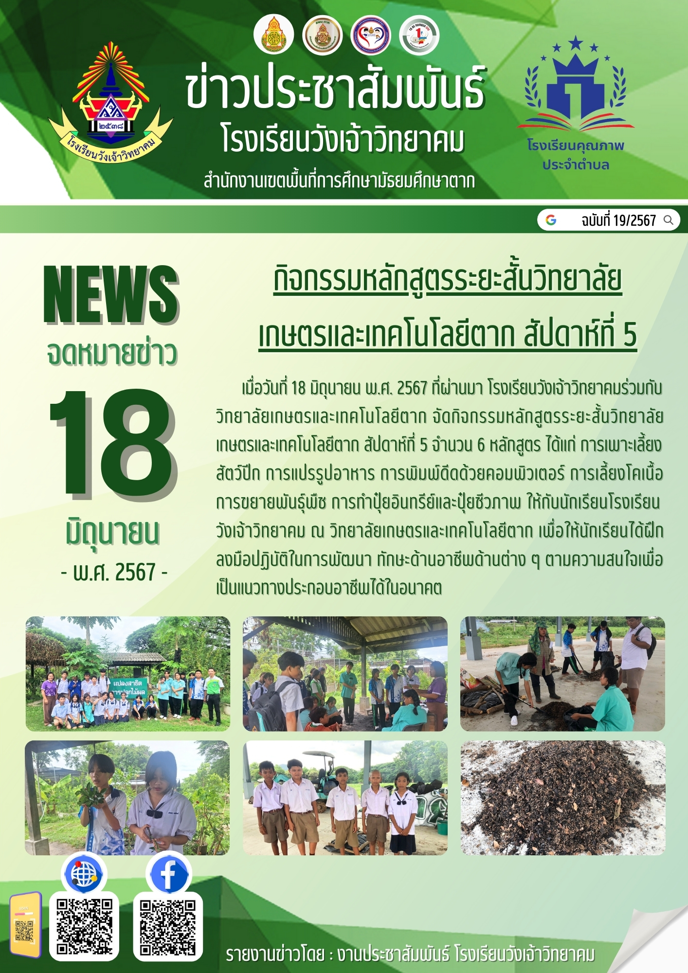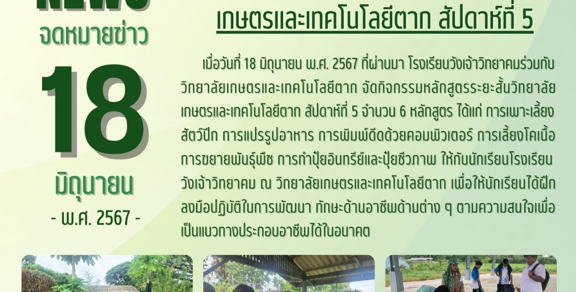 โรงเรียนวังเจ้าวิทยาคม กิจกรรมหลักสูตรระยะสั้นวิทยาลัยเกษตรและเทคโนโลยีตาก สัปดาห์ที่ 5 วงศธร แตงทอง 19 มิถุนายน 2567 จำนวนคนดู 2