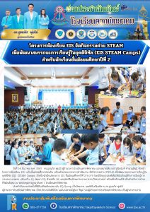 วันที่ 14 ธันวาคม พ.ศ. 2567 ดร.ภูธนภัส พุ่มไม้ ผู้อำนวยการโรงเรียนตากพิทยาคม มอบหมายให้นางสาวณิชนันท์ คำนวนสินธุ์ หัวหน้าโครงการห้องเรียน EIS ระดับชั้นมัธยมศึกษาตอนต้น พร้อมด้วยคณะกรรมการดำเนินงาน จัดกิจกรรมค่าย STEAM เพื่อพัฒนาสมรรถนะการเรียนรู้ในยุคดิจิทัล (EIS STEAM Camps) สำหรับนักเรียนโครงการ EIS ชั้นมัธยมศึกษาปีที่ 2/4-2/9 โดยมีวัตถุประสงค์เพื่อให้นักเรียนได้รับการเรียนรู้จากประสบการณ์ตรง เสริมสร้าง IQ พัฒนา EQ ด้วยหลัก 3ส. และส่งเสริมทักษะกระบวนการทางวิทยาศาสตร์ พร้อมฝึกทักษะที่จำเป็นสำหรับการดำรงชีวิตในสังคม ณ หอประชุมกาญจนาภิเษก 1 โรงเรียนตากพิทยาคม