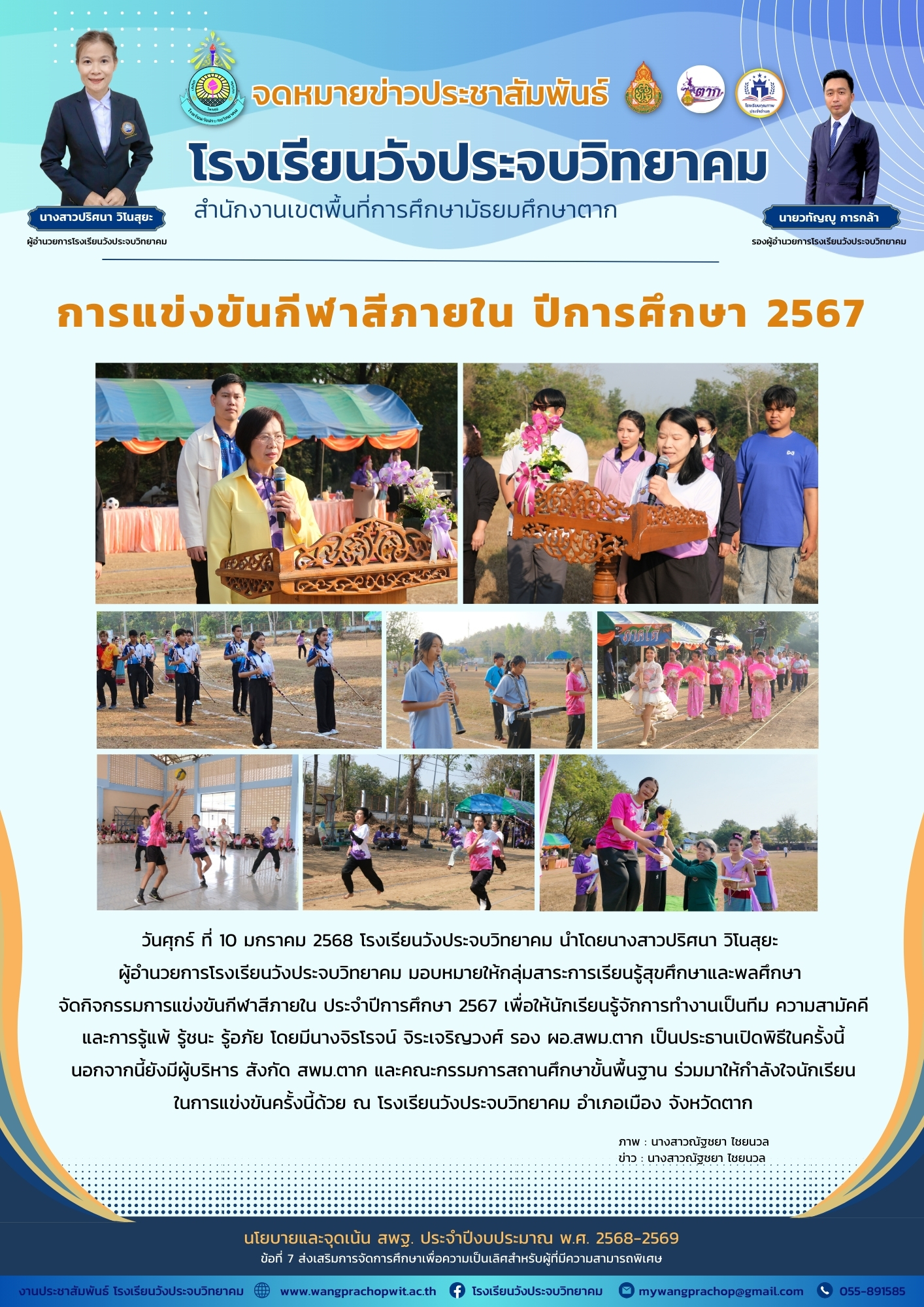 วันศุกร์ ที่ 10 มกราคม 2568 โรงเรียนวังประจบวิทยาคม นำโดยนางสาวปริศนา วิโนสุยะ ผู้อำนวยการโรงเรียนวังประจบวิทยาคม มอบหมายให้กลุ่มสาระการเรียนรู้สุขศึกษาและพลศึกษา จัดกิจกรรมการแข่งขันกีฬาสีภายใน ประจำปีการศึกษา 2567 เพื่อให้นักเรียนรู้จักการทำงานเป็นทีม ความสามัคคี และการรู้แพ้ รู้ชนะ รู้อภัย โดยมีนางจิรโรจน์ จิระเจริญวงศ์ รอง ผอ.สพม.ตาก เป็นประธานเปิดพิธีในครั้งนี้ นอกจากนี้ยังมีผู้บริหาร สังกัด สพม.ตาก และคณะกรรมการสถานศึกษาขั้นพื้นฐาน ร่วมมาให้กำลังใจนักเรียน ในการแข่งขันครั้งนี้ด้วย ณ โรงเรียนวังประจบวิทยาคม อำเภอเมือง จังหวัดตาก