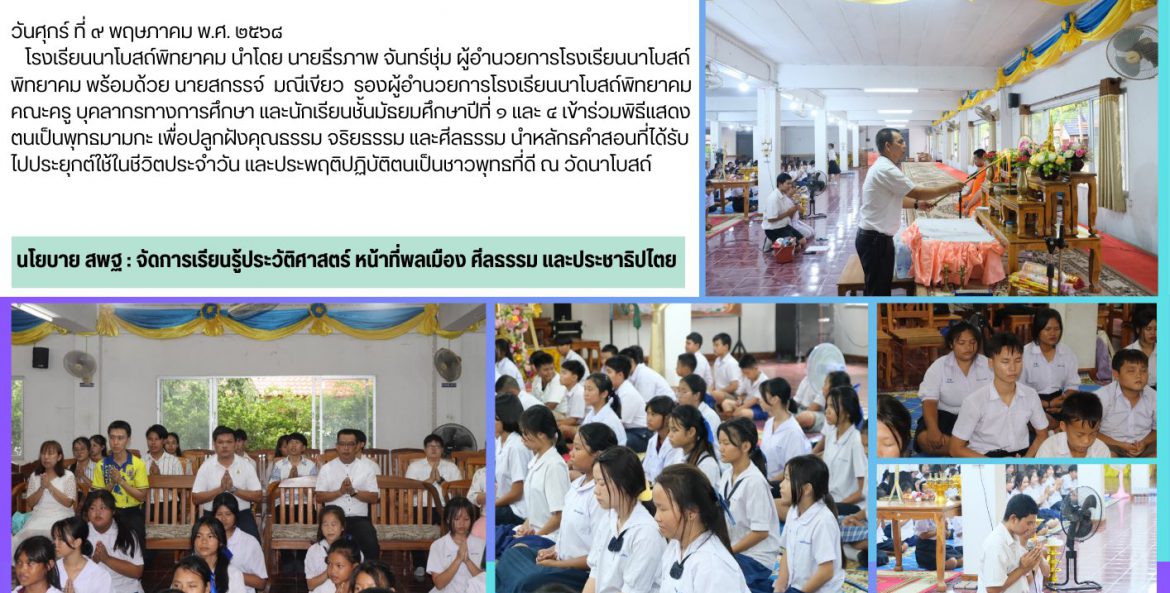 วันศุกร์ ที่ ๙ พฤษภาคม พ.ศ. ๒๕๖๘ โรงเรียนนาโบสถ์พิทยาคม นำโดย นายธีรภาพ จันทร์ชุ่ม ผู้อำนวยการโรงเรียนนาโบสถ์พิทยาคม พร้อมด้วย นายสกรรจ์ มณีเขียว รองผู้อำนวยการโรงเรียนนาโบสถ์พิทยาคม คณะครู บุคลากรทางการศึกษา และนักเรียนชั้นมัธยมศึกษาปีที่ ๑ และ ๔ เข้าร่วมพิธีแสดงตนเป็นพุทธมามกะ เพื่อปลูกฝังคุณธรรม จริยธรรม และศีลธรรม นำหลักธคำสอนที่ได้รับไปประยุกต์ใช้ในชีวิตประจำวัน และประพฤติปฏิบัติตนเป็นชาวพุทธที่ดี ณ วัดนาโบสถ์