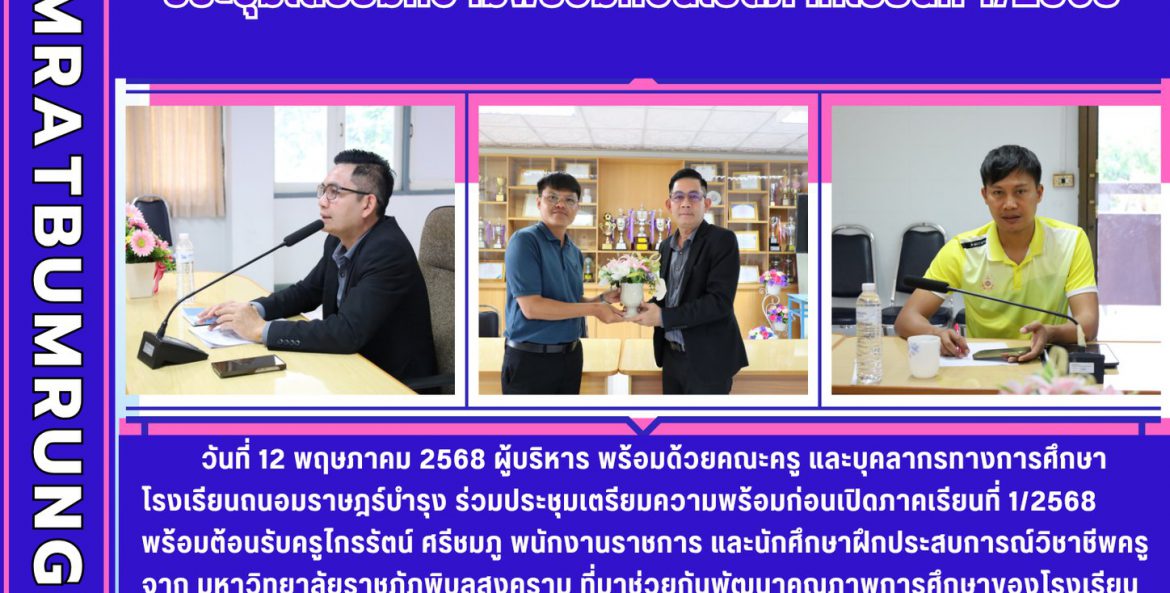วันที่ 12 พฤษภาคม 2568 ผู้บริหาร พร้อมด้วยคณะครู และบุคลากรทางการศึกษาโรงเรียนถนอมราษฎร์บำรุง ร่วมประชุมเตรียมความพร้อมก่อนเปิดภาคเรียนที่ 1/2568 พร้อมต้อนรับครูไกรรัตน์ ศรีชมภู พนักงานราชการ และนักศึกษาฝึกประสบการณ์วิชาชีพครู จากมหาวิทยาลัยราชภัฏพิบูลสงคราม ที่มาช่วยกันพัฒนาคุณภาพการศึกษาของโรงเรียน ณ ห้องประชุมโสตทัศนศึกษา “ธารน้ำใจ” โรงเรียนถนอมราษฎร์บำรุง