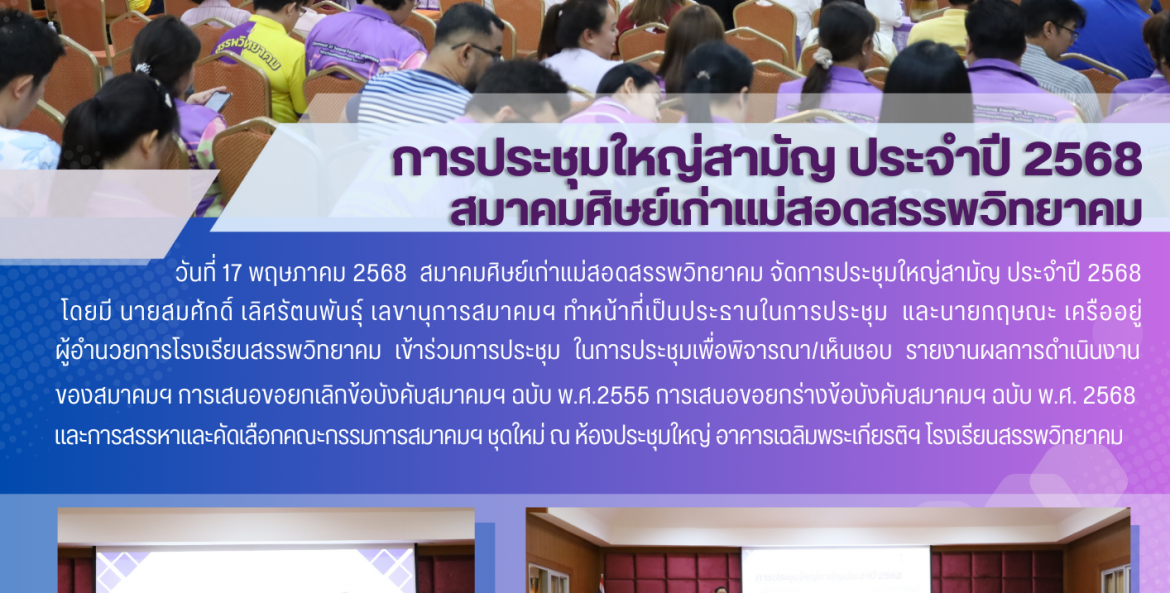 โรงเรียนสรรพวิทยาคม : จัดประชุมใหญ่สามัญประจำปี ๒๕๖๘ สมาคมศิษย์เก่าแม่สอดสรรพวิทยาคม นิรมล พิพัฒน์คุปติกุล 19 พฤษภาคม 2568 จำนวนคนดู 0