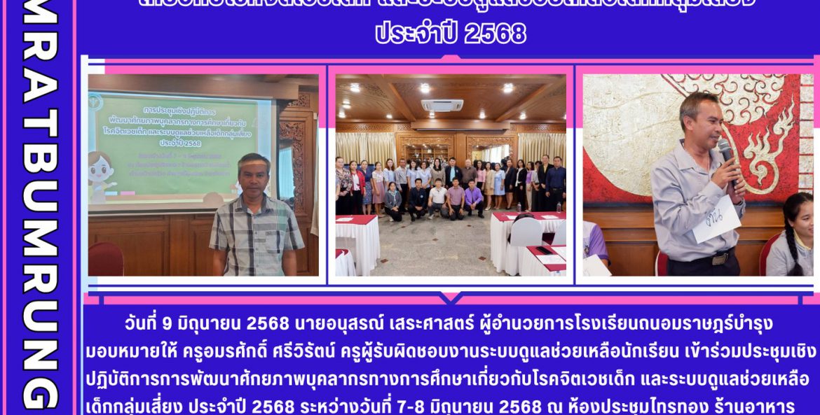นายอนุสรณ์ เสระศาสตร์ ผู้อำนวยการโรงเรียนถนอมราษฎร์บำรุง มอบหมายให้ ครูอมรศักดิ์ ศรีวิรัตน์ ครูผู้รับผิดชอบงานระบบดูแลช่วยเหลือนักเรียน เข้าร่วมประชุมเชิงปฏิบัติการการพัฒนาศักยภาพบุคลากรทางการศึกษาเกี่ยวกับโรคจิตเวชเด็ก และระบบดูแลช่วยเหลือเด็กกลุ่มเสี่ยง ประจำปี 2568 ระหว่างวันที่ 7-8 มิถุนายน 2568 ณ ห้องประชุมไทรทอง ร้านอาหารบ้านเคียงน้ำ ตำบลป่ามะม่วง อำเภอเมืองตาก จังหวัดตาก