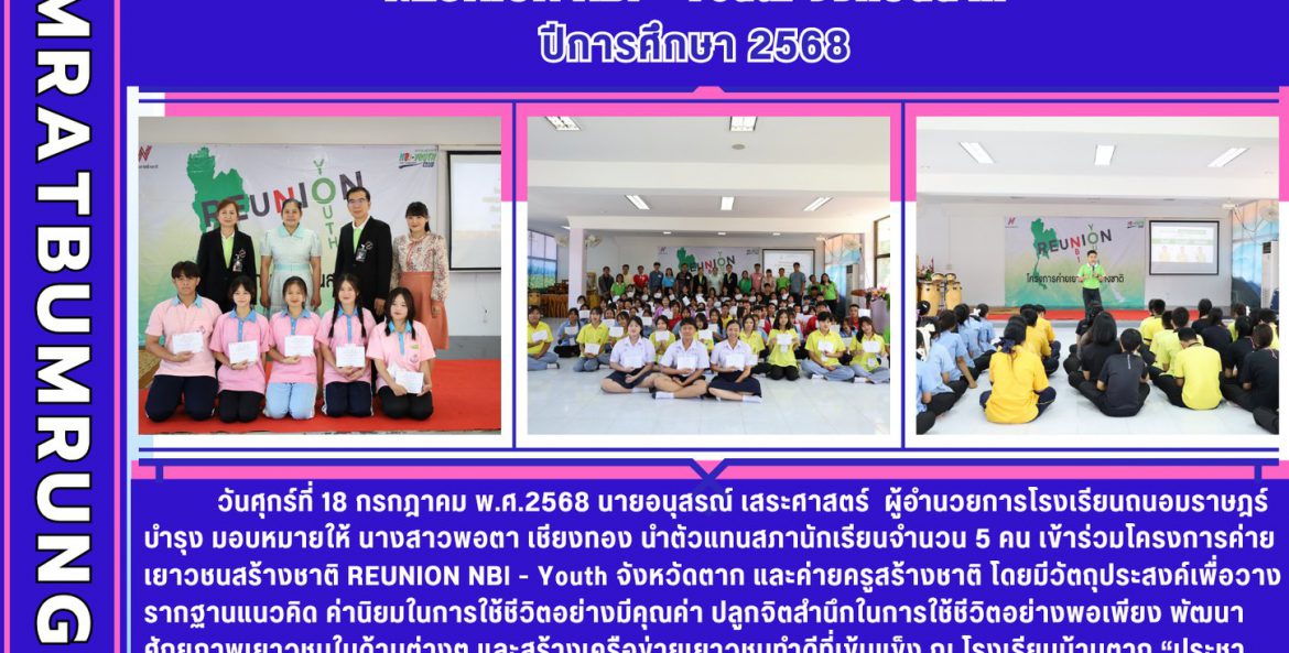 วันศุกร์ที่ 18 กรกฎาคม พ.ศ.2568 นายอนุสรณ์ เสระศาสตร์ ผู้อำนวยการโรงเรียนถนอมราษฎร์บำรุง มอบหมายให้ นางสาวพอตา เชียงทอง นำตัวแทนสภานักเรียนจำนวน 5 คน เข้าร่วมโครงการค่ายเยาวชนสร้างชาติ REUNION NBl – Youth จังหวัดตาก และค่ายครูสร้างชาติ โดยมีวัตถุประสงค์เพื่อวางรากฐานแนวคิด ค่านิยมในการใช้ชีวิตอย่างมีคุณค่า ปลูกจิตสำนึกในการใช้ชีวิตอย่างพอเพียง พัฒนาศักยภาพเยาวชนในด้านต่างๆ และสร้างเครือข่ายเยาวชนทำดีที่เข้มแข็ง ณ โรงเรียนบ้านตาก “ประชาวิทยาคาร”