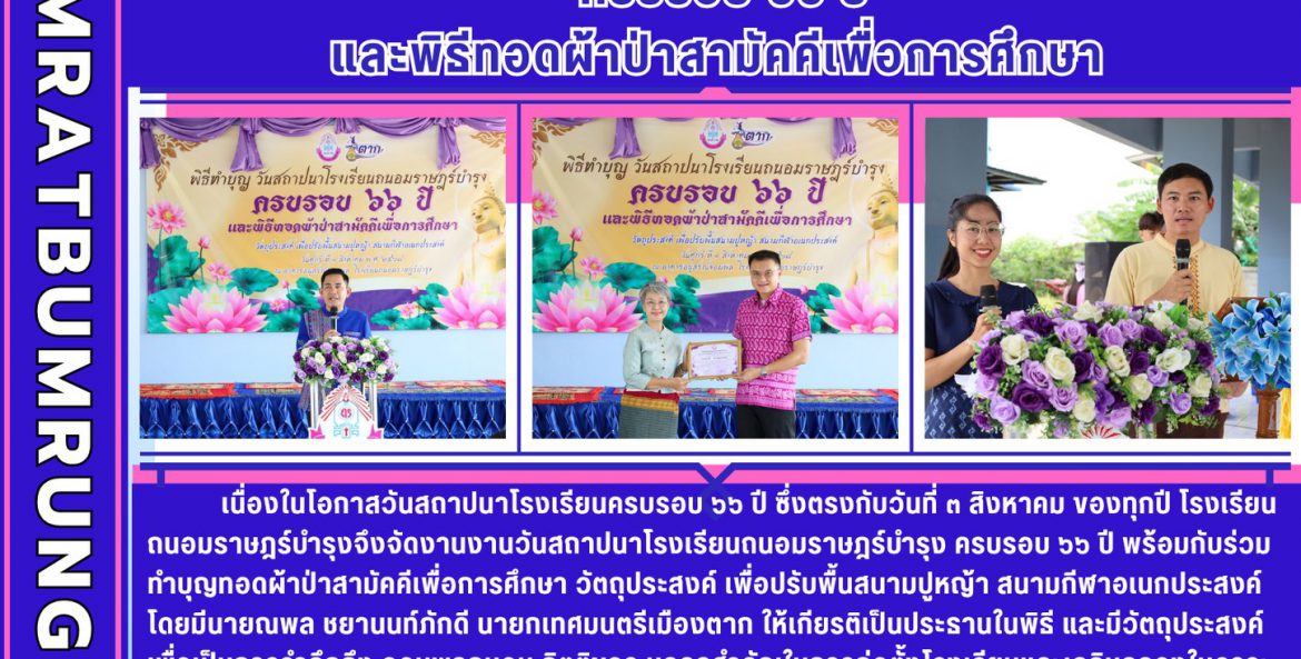 เนื่องในโอกาสวันสถาปนาโรงเรียนครบรอบ ๖๖ ปี ซึ่งตรงกับวันที่ ๓ สิงหาคม ของทุกปี โรงเรียนถนอมราษฎร์บำรุงจึงจัดงานวันสถาปนาโรงเรียนถนอมราษฎร์บำรุงครบรอบ ๖๖ ปี พร้อมกับร่วมทำบุญทอดผ้าป่าสามัคคีเพื่อการศึกษา วัตถุประสงค์ เพื่อปรับพื้นสนามปูหญ้า สนามกีฬาอเนกประสงค์โดยมีนายณพล ชยานนท์ภักดี นายกเทศมนตรีเมืองตาก ให้เกียรติเป็นประธานในพิธี และมีวัตถุประสงค์ เพื่อเป็นการรำลึกถึง จอมพลถนอม กิตติขจร บุคคลสำคัญในการก่อตั้งโรงเรียนและเฉลิมฉลองในวาระสำคัญที่โรงเรียนครบรอบ ๖๖ ปี เพื่อพัฒนาคุณภาพการศึกษา สานสัมพันธ์ พบปะสังสรรค์ ระหว่างผู้อำนวยการโรงเรียน คณะครูเก่า ศิษย์เก่า ครูปัจจุบัน นักเรียน ผู้ปกครองและองค์กรหลัก ตลอดจนชุมชนผู้ให้การสนับสนุนในการบริหารจัดการโรงเรียน โดยในงานมีการจัดกิจกรรมต่างๆ อาทิ การมอบประกาศเกียรติบัตรเชิดชูเกียรติผู้มีผู้คุณูปการต่อโรงเรียนถนอมราษฎร์บำรุง ครูเก่าดีเด่น ศิษย์เก่าดีเด่น ทางโรงเรียนขอขอบพระคุณผู้มีจิตศรัทธา แขกผู้มีเกียรติ และผู้มีส่วนเกี่ยวข้องทุกท่าน ที่ทำให้งานสำเร็จลุล่วงไปได้ด้วยดี