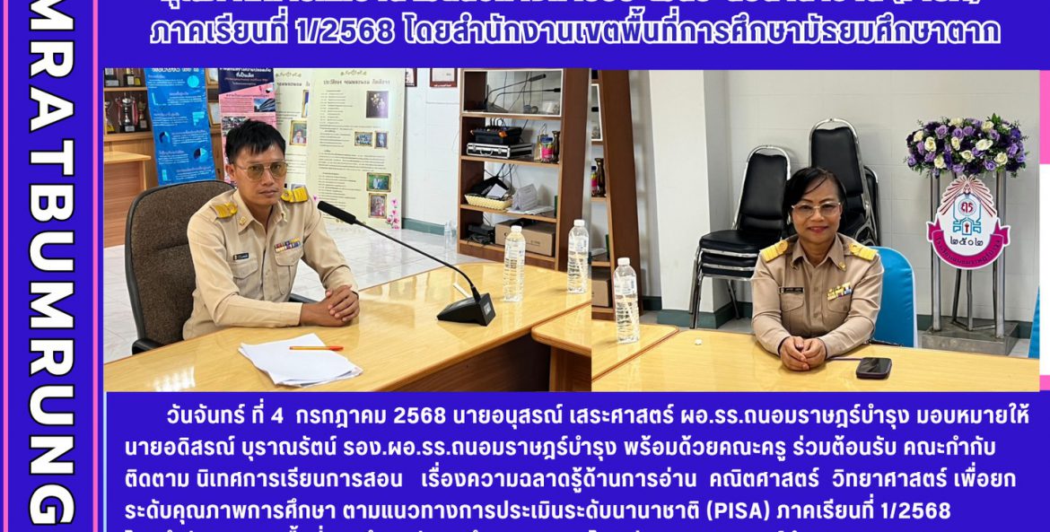 วันจันทร์ ที่ 4 กรกฎาคม 2568 นายอนุสรณ์ เสระศาสตร์ ผอ.รร.ถนอมราษฎร์บำรุง มอบหมายให้ นายอดิสรณ์ บุราณรัตน์ รอง.ผอ.รร.ถนอมราษฎร์บำรุง พร้อมด้วยคณะครู ร่วมต้อนรับ คณะกำกับ ติดตาม นิเทศการเรียนการสอน เรื่องความฉลาดรู้ด้านการอ่าน คณิตศาสตร์ วิทยาศาสตร์ เพื่อยกระดับคุณภาพการศึกษา ตามแนวทางการประเมินระดับนานาชาติ (PISA) ภาคเรียนที่ 1/2568 โดยสำนักงานเขตพื้นที่การศึกษามัธยมศึกษาตาก ณ โรงเรียนถนอมราษฎร์บำรุง