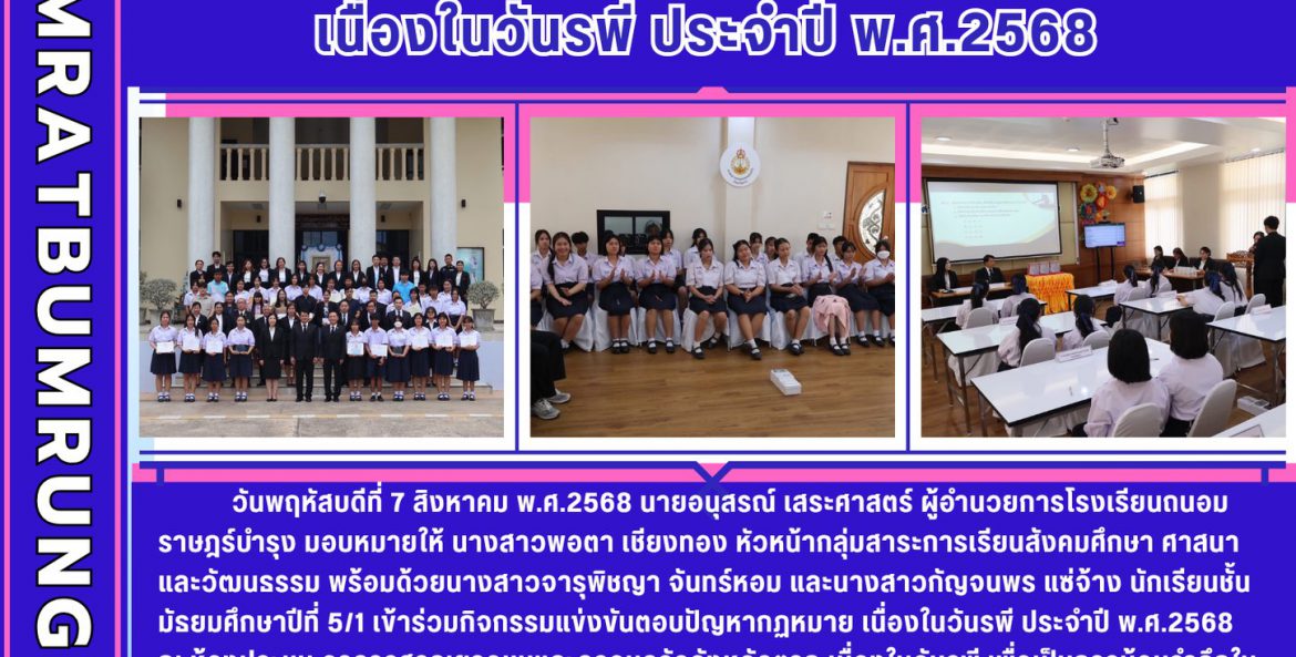 วันพฤหัสบดีที่ 7 สิงหาคม พ.ศ.2568 นายอนุสรณ์ เสระศาสตร์ ผู้อำนวยการโรงเรียนถนอมราษฎร์บำรุง มอบหมายให้ นางสาวพอตา เชียงทอง หัวหน้ากลุ่มสาระการเรียนสังคมศึกษา ศาสนา และวัฒนธรรม พร้อมด้วยนางสาวจารุพิชญา จันทร์หอม และนางสาวกัญจนพร แซ่จ้าง นักเรียนชั้นมัธยมศึกษาปีที่ 5/1 เข้าร่วมกิจกรรมแข่งขันตอบปัญหากฏหมาย เนื่องในวันรพี ประจำปี พ.ศ.2568 ณ ห้องประชุม อาคารศาลเยาวชนและครอบครัวจังหวัดตาก เนื่องในวันรพี เพื่อเป็นการน้อมรำลึกใน พระมหากรุณาธิคุณ ของพระองค์รพีพัฒนศักดิ์ พระบิดาแห่งกฎหมาย