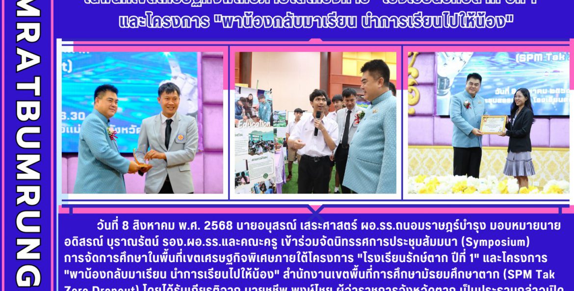 วันที่ 8 สิงหาคม พ.ศ. 2568 นายอนุสรณ์ เสระศาสตร์ ผอ.รร.ถนอมราษฎร์บำรุง มอบหมายนายอดิสรณ์ บุราณรัตน์ รอง.ผอ.รร.และคณะครู เข้าร่วมจัดนิทรรศการประชุมสัมมนา (Symposium) การจัดการศึกษาในพื้นที่เขตเศรษฐกิจพิเศษภายใต้โครงการ “โรงเรียนรักษ์ตาก ปีที่ 1” และโครงการ “พาน้องกลับมาเรียน นำการเรียนไปให้น้อง” สำนักงานเขตพื้นที่การศึกษามัธยมศึกษาตาก (SPM Tak Zero Dropout) เพื่อสรุปผลการขับเคลื่อนขยายผลการจัดทำ พัฒนารายวิชาเพิ่มเติม หลักสูตรสถานศึกษา สื่อ นวัตกรรม และกิจกรรมที่สอดคล้องกับอุตสาหกรรมตามบริบทพื้นที่โรงเรียน โดยได้รับเกียรติจาก นายชูชีพ พงษ์ไชย ผู้ว่าราชการจังหวัดตาก เป็นประธานกล่าวเปิดกิจกรรม และ นายอาณัติ ผาพรม ผู้อำนวยการสำนักงานเขตพื้นที่การศึกษามัธยมศึกษาตาก เป็นประธานกล่าวต้อนรับ พร้อมคณะผู้บริหาร คณะครู และบุคลากรทางการศึกษาจากโรงเรียนในสังกัดสำนักงานเขตพื้นที่การศึกษามัธยมศึกษาตาก เข้าร่วมประชุมอย่างพร้อมเพรียง ณ หอประชุมใหญ่ อาคารสรรพการ โรงเรียนสรรพวิทยาคม อำเภอแม่สอด จังหวัดตาก