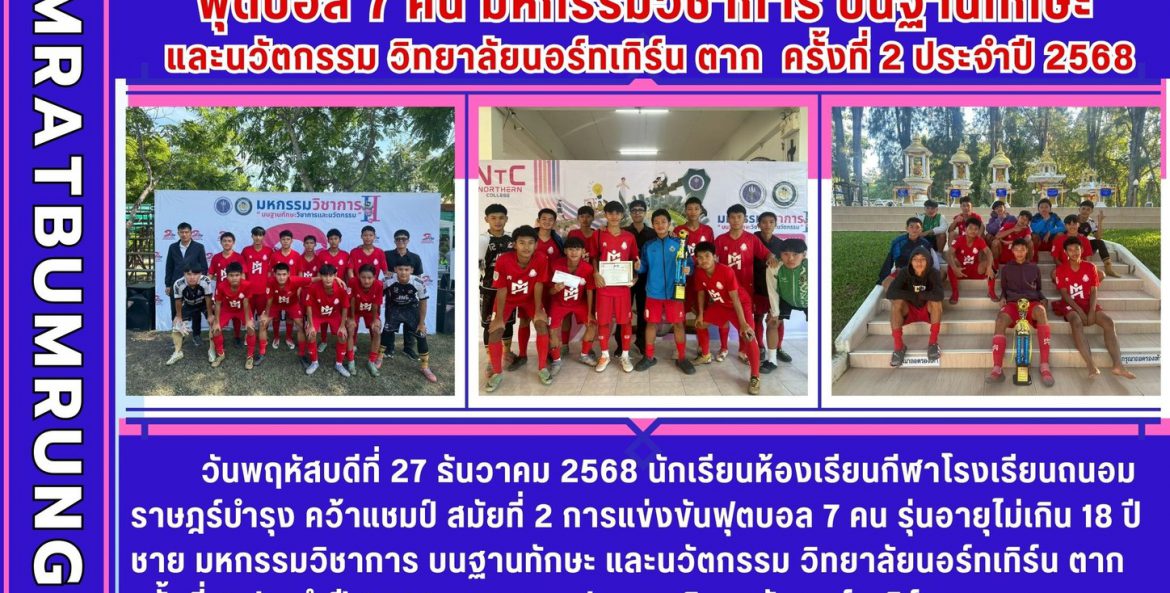 #นักเรียนห้องเรียนกีฬาโรงเรียนถนอมราษฎร์บำรุง คว้าแชมป์ สมัยที่ 2 การแข่งขันฟุตบอล 7 คน รุ่นอายุไม่เกิน 18 ปีชาย พันธกานต์ อุจจภูรี 7 ธันวาคม 2568 #คว้าแชมป์ สมัยที่ 2 #นักเรียนห้องเรียนกีฬาโรงเรียนถนอมราษฎร์บำรุง คว้าแชมป์ สมัยที่ 2 การแข่งขันฟุตบอล 7 คน รุ่นอายุไม่เกิน 18 ปีชาย มหกรรมวิชาการ บนฐานทักษะ และนวัตกรรม วิทยาลัยนอร์ทเทิร์น ตาก ครั้งที่ 2 ประจำปี 2568 ณ สนามฟุตบอล วิทยาลัยนอร์ทเทิร์น ตาก #ขอขอบคุณนักกีฬา ทุกคน ที่มุ่งมั่นตั้งใจ จนคว้าชัยชนะมาในครั้งนี้ ขอบคุณผู้อำนวยการ รองผู้อำนวยการ โค้ชบัง ครูพั้น พร้อมทีมงาน และผู้สนับสนุนทุกท่านนะคะ ที่ช่วยส่งเสริมนักกีฬา ฝึกฝน ฝึกซ้อม และสร้างชื่อเสียงให้โรงเรียน ขอเป็นกำลังใจให้นักเรียนห้องเรียนกีฬาต่อไปค่ะ จำนวนคนดู 0