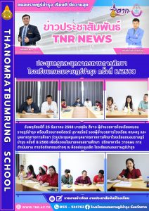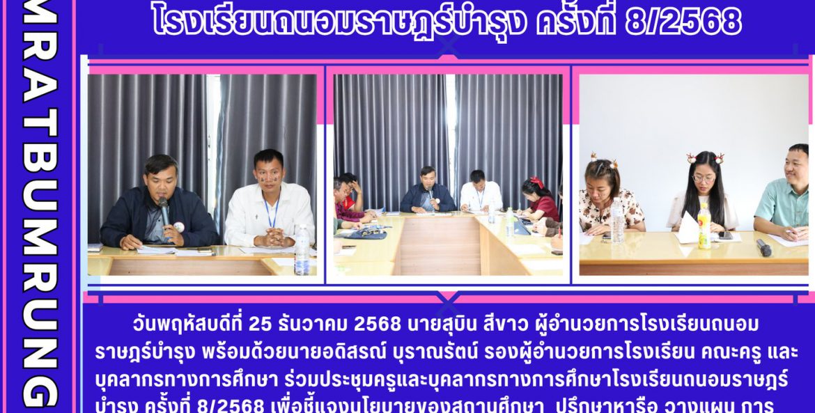 วันพฤหัสบดีที่ 25 ธันวาคม 2568 นายสุบิน สีขาว ผู้อำนวยการโรงเรียนถนอมราษฎร์บำรุง พร้อมด้วยนายอดิสรณ์ บุราณรัตน์ รองผู้อำนวยการโรงเรียน คณะครู และบุคลากรทางการศึกษา ร่วมประชุมครูและบุคลากรทางการศึกษาโรงเรียนถนอมราษฎร์บำรุง ครั้งที่ 8/2568 เพื่อชี้แจงนโยบายของสถานศึกษา ปรึกษาหารือ วางแผน การดำเนินงาน การจัดกิจกรรมต่างๆ ณ ห้องประชุมเล็ก โรงเรียนถนอมราษฎร์บำรุง