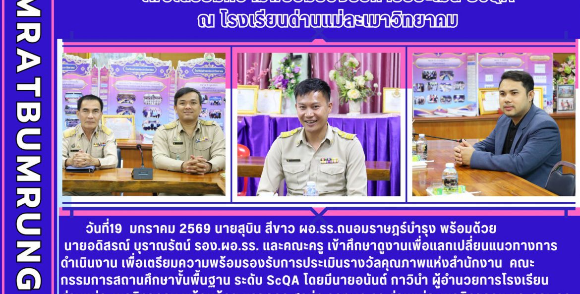 วันที่19 มกราคม 2569 นายสุบิน สีขาว ผอ.รร.ถนอมราษฎร์บำรุง พร้อมด้วย นายอดิสรณ์ บุราณรัตน์ รอง.ผอ.รร. และคณะครู เข้าศึกษาดูงานเพื่อแลกเปลี่ยนแนวทางการดำเนินงาน เพื่อเตรียมความพร้อมรองรับการประเมินรางวัลคุณภาพแห่งสำนักงาน คณะกรรมการสถานศึกษาขั้นพื้นฐาน ระดับ ScQA โดยมีนายอนันต์ กาวินำ ผู้อำนวยการโรงเรียนด่านแม่ละเมาวิทยาคม พร้อมด้วย นายธดล สาบุ่ง รองผอ.รร.ด่านแม่ละเมาวิทยาคม และคณะครู ร่วมให้การต้อนรับอย่างอบอุ่น ณ ห้องโสตทัศนูปกรณ์ โรงเรียนด่านแม่ละเมาวิทยาคม